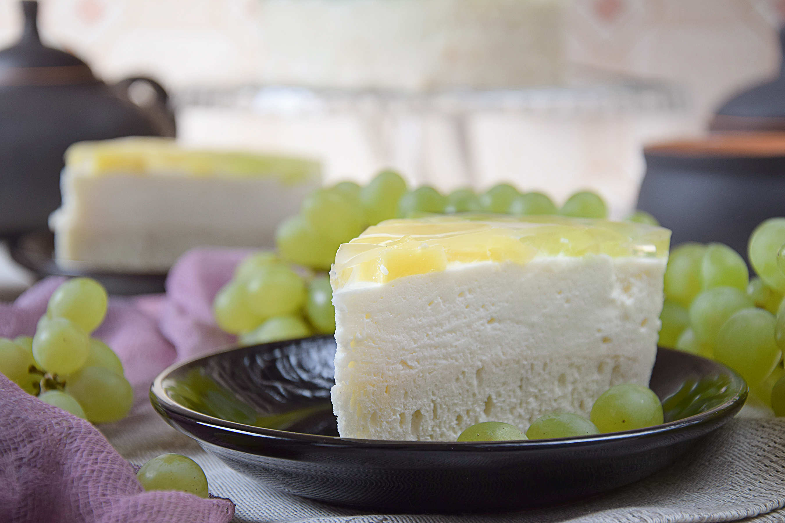 Кусочек торта со дня рождения мужа :) Вчера по такому случаю прикупила стеклянную подставку для торта, которую разместила на заднем плане. Белой посуды у меня нет, но здесь и торт светлый, поэтому, для контраста, фотографировала с тёмным керамическим сервизом. В левом нижнем углу марля, которую я покрасила, как говорилось в одном из уроков. На торте, под желе, виноград и консервированные ананасы, поэтому в качестве украшения - грозди винограда. Снимку добавила яркости и положительной экспокоррекции. Жду Ваших рецензий.