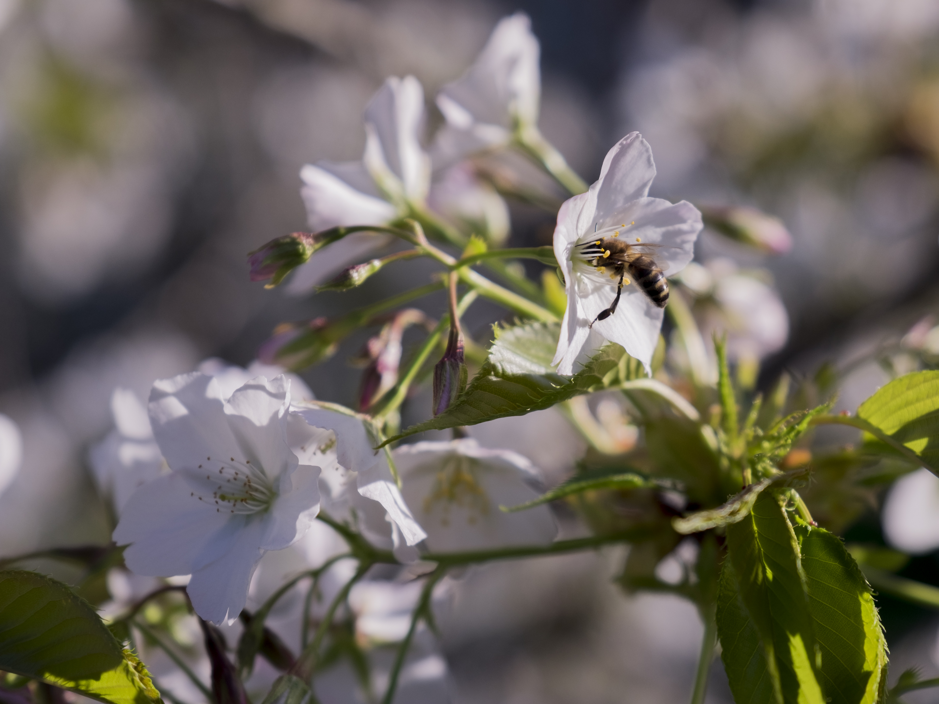 Маленькая глубина резкости помогает размыть фон , цветочек и пчела в нем отлично выделяются на размытом фоне .