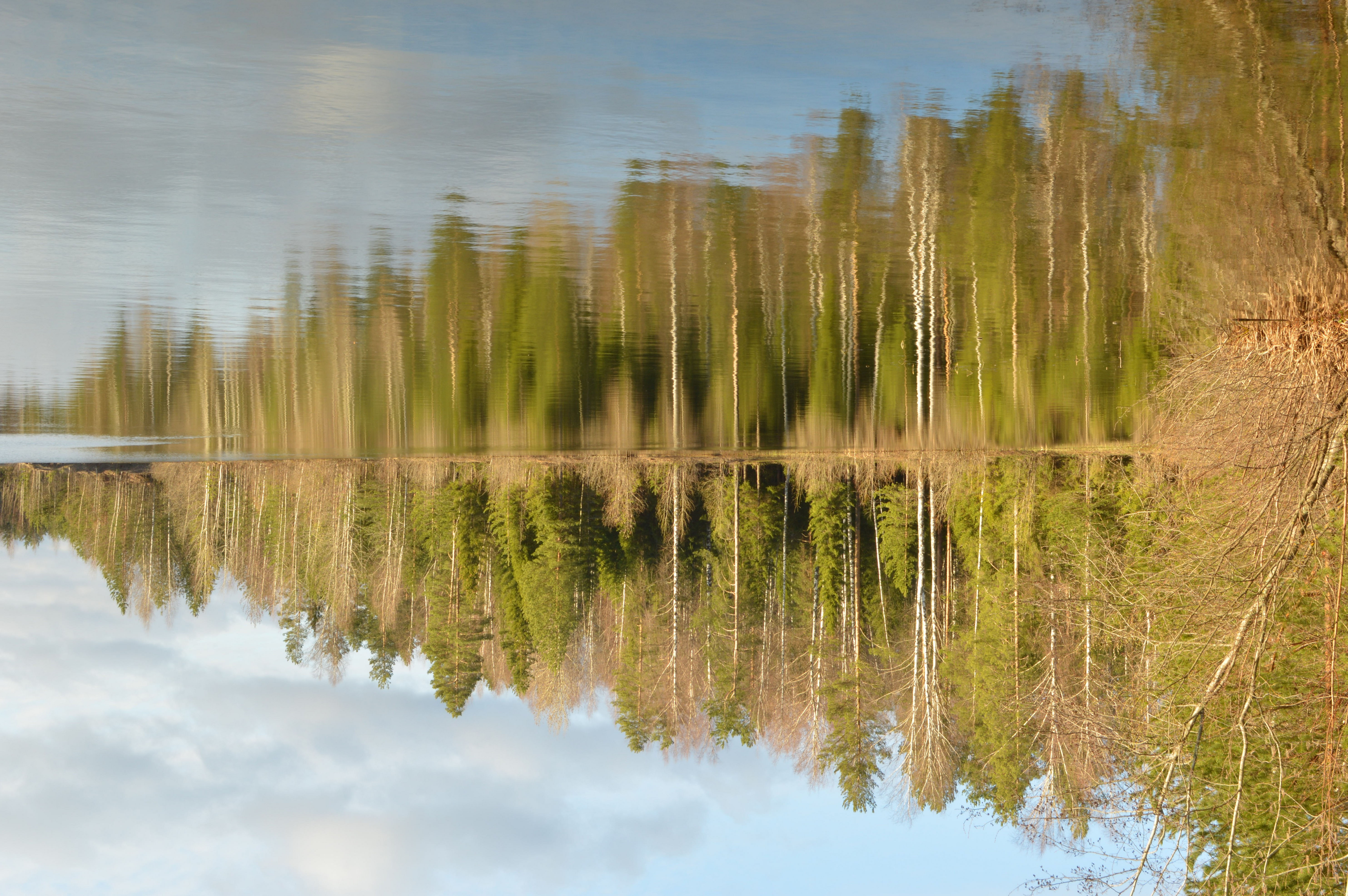 Снимала лес на берегу пруда на рассвете. Идеального отражения не получилось, ветер помешал. Горизонт выровняла и захотелось еще перевернуть снимок. В таком варианте мне тоже понравилось.