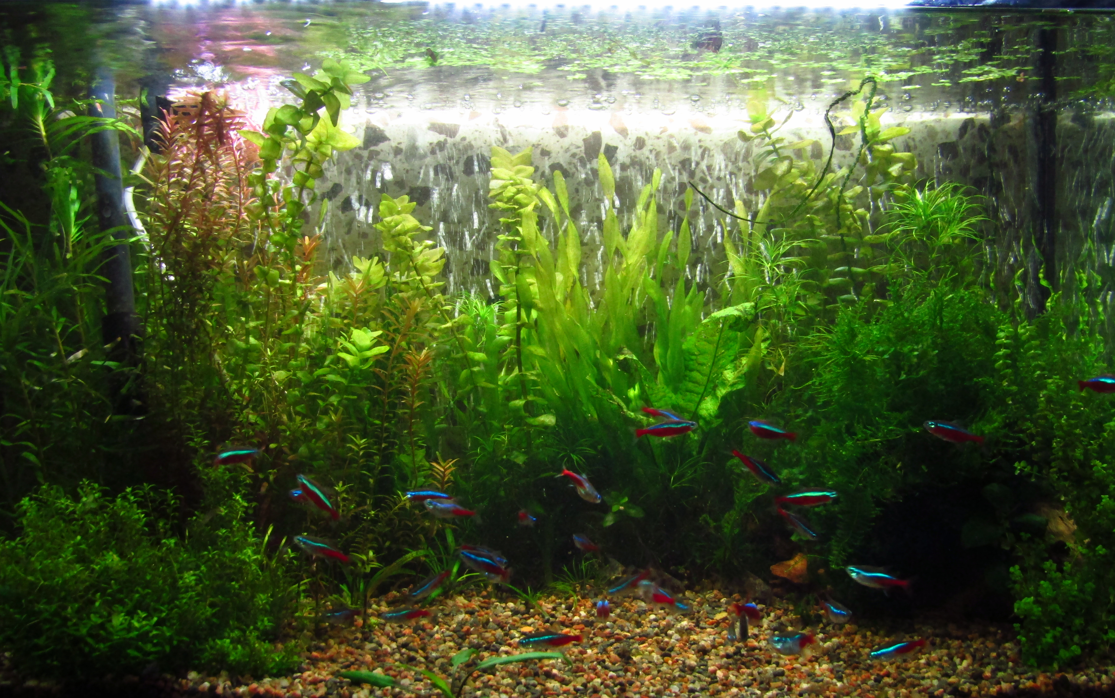 Освещение направлено сверху, мягкими тенями и бликами выделен объем и глубина аквариума.