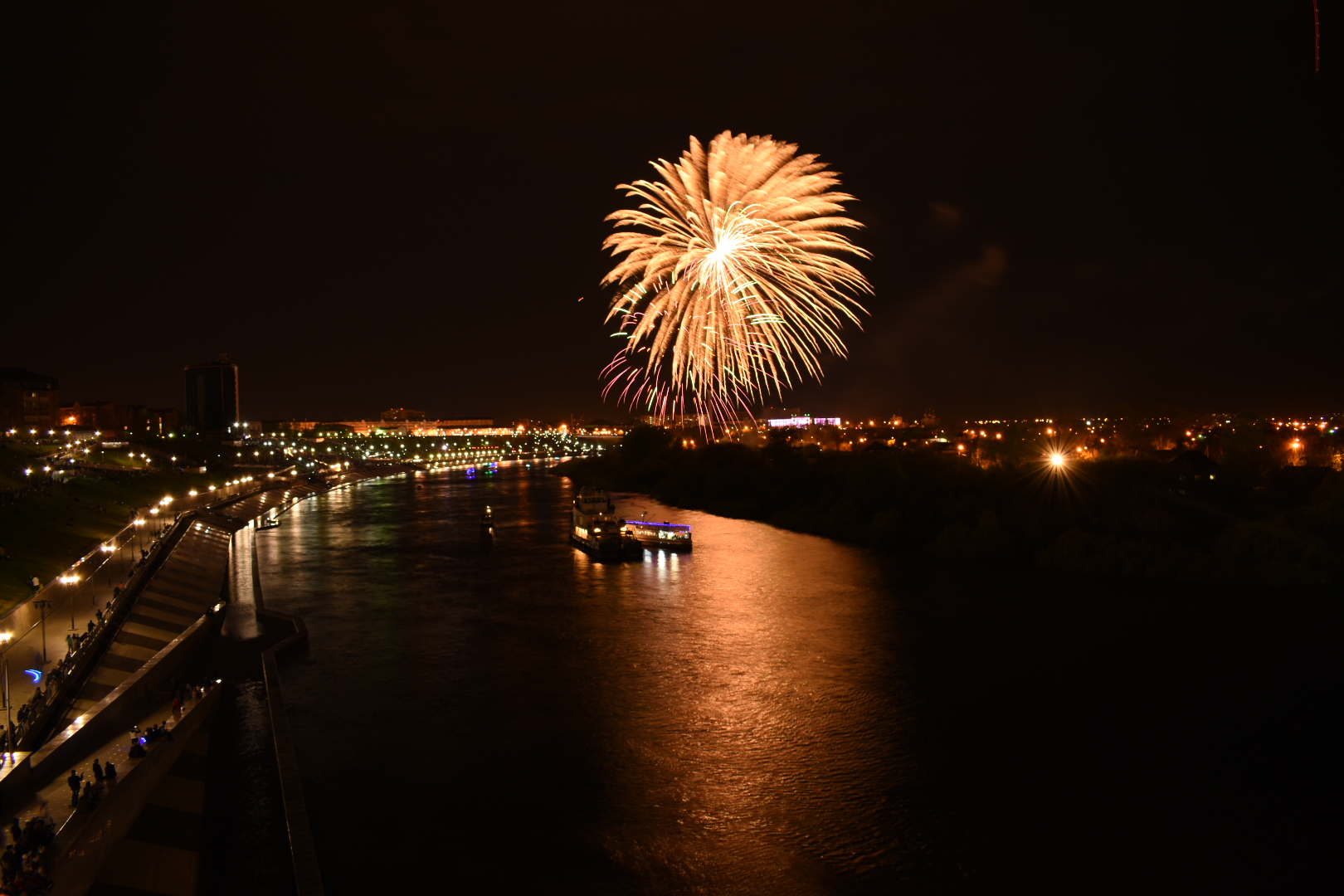 Верно, что для съемки салюта выбрали длинную выдержку - поймали несколько залпов и красиво смазали огни. К тому же, при недостатке света съемка на длинной выдержке позволяет сохранить минимальное ИСО.