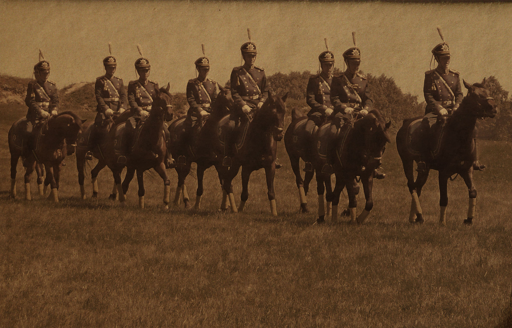 Снимок сделан во время исторической реконструкции Бородинского сражения. С помощью обрезки и ретуши убрал "лазутчиков" с будущего. Для стилизации под старину его затонировал, 35% установил непрозрачность, наложил снимок старой плотной бумаги и добавил немного "шума". Затем чуть высветил тени.