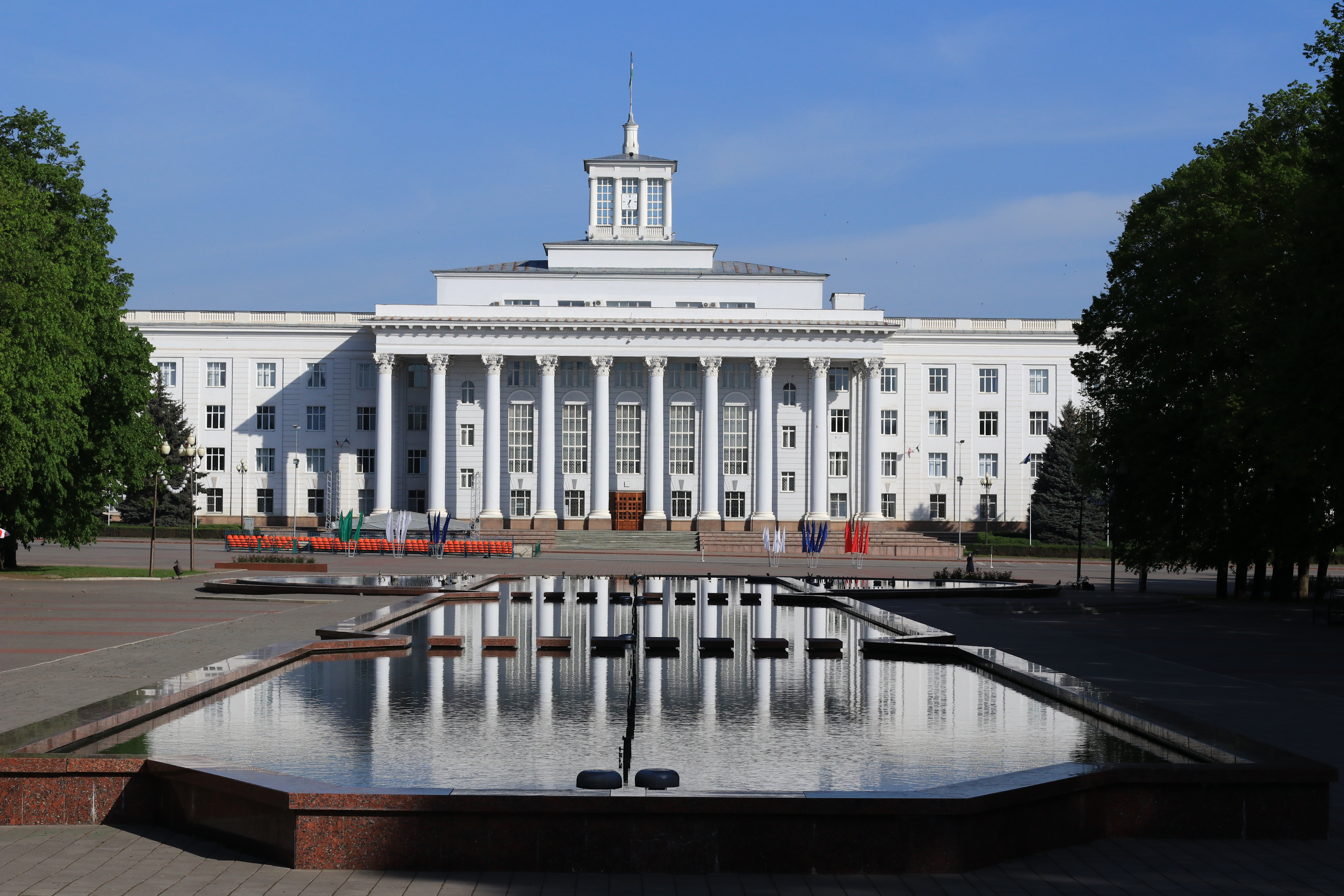 Интереснее будет смотреться композиция, если сделать кадр прямо от поверхности воды (хотя бы бортика фонтана) - тогда отражение будет более симметричным и в кадр попадет меньше лишнего.