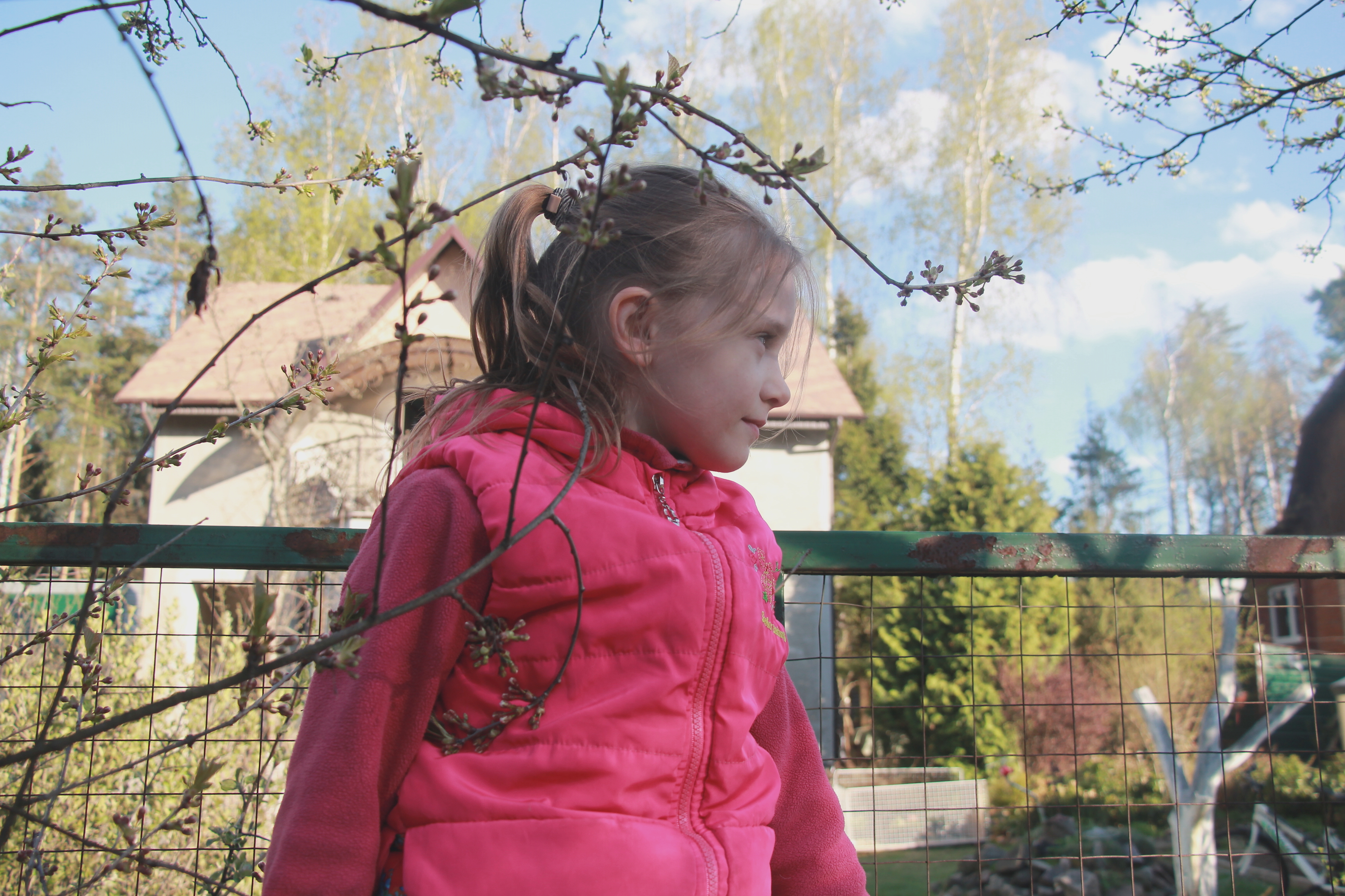 Сидит на ветке дерева и думает, как же спрыгнуть, а высота больше метра. А я не думая фотографировала, без подготовки, а потом начала думать как же её снять от туда. А что получилось? Кажется правильно. Взгляд за кадром, задний фон немного размыт, резкость есть. А дальше жду вашу оценку.
