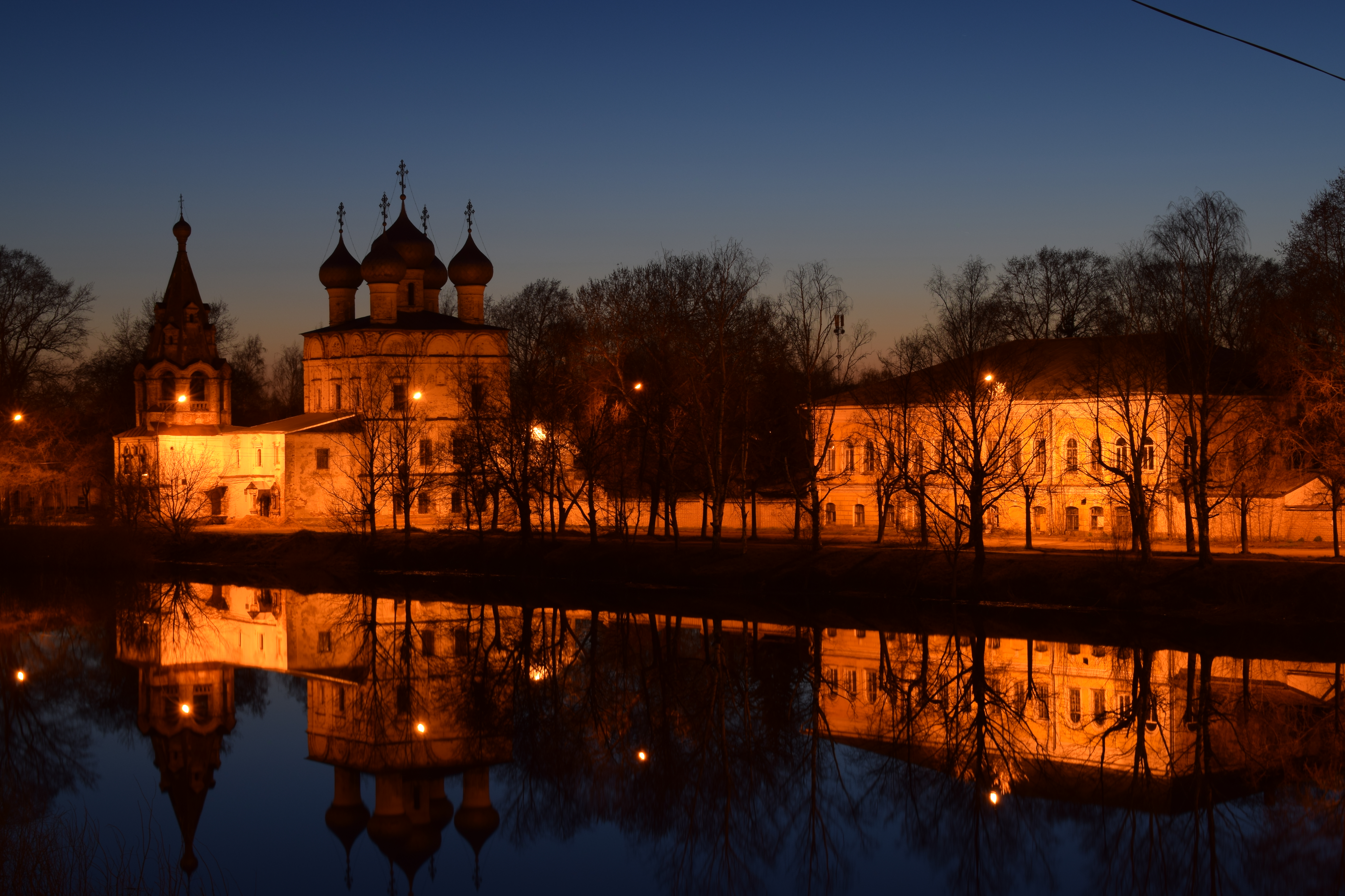 Вы отлично подобрали ракурс, включая в кадр отражение, это создает симметрию в композиции. Отлично, что снимали в сумерках, а не ночью - сохранился синий оттенок неба, контрастирующий с фонарями.
