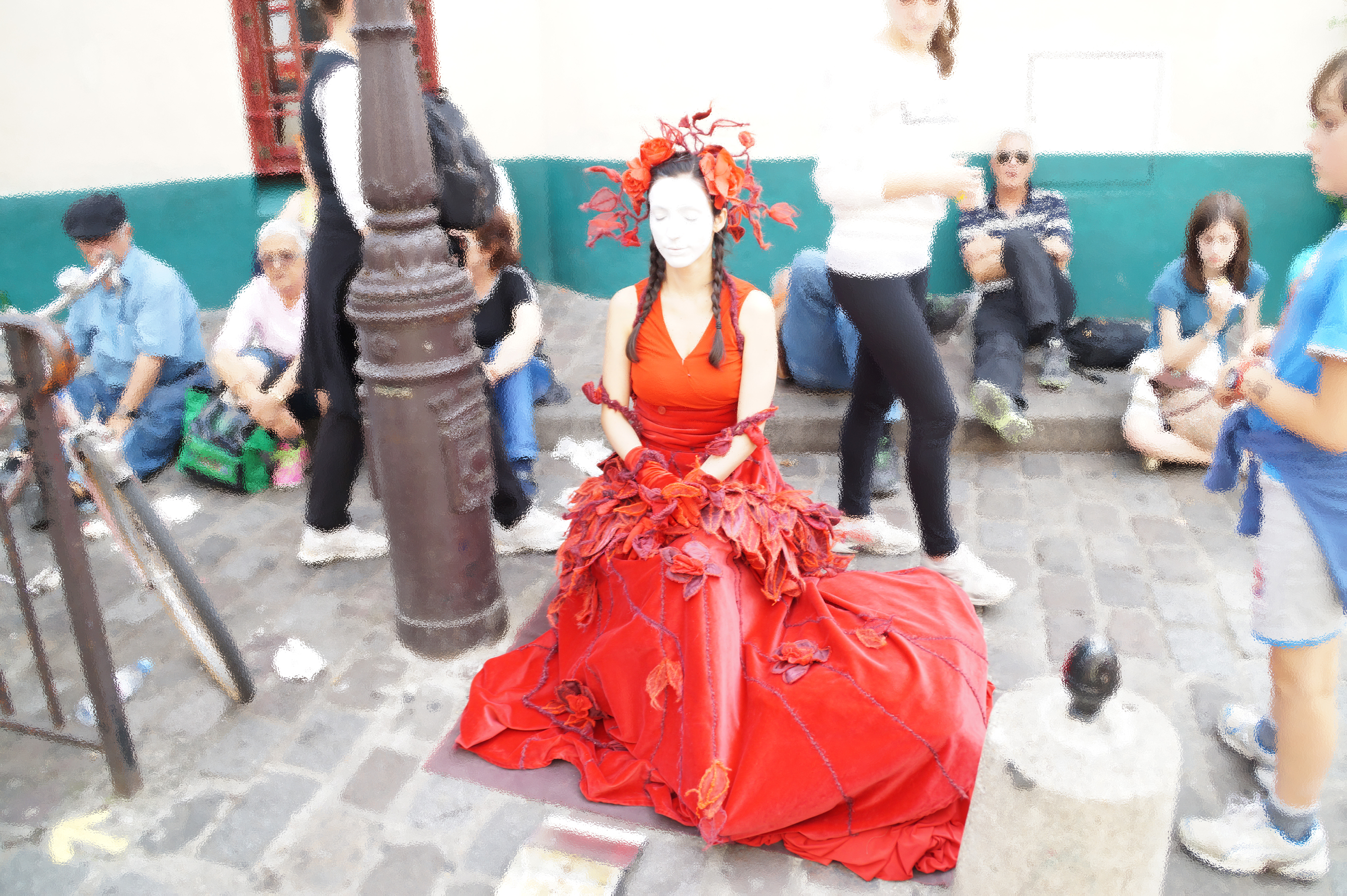 Применена Архивная кисть. Поскольку главная здесь-девушка в красном, остальные остались за стеклом