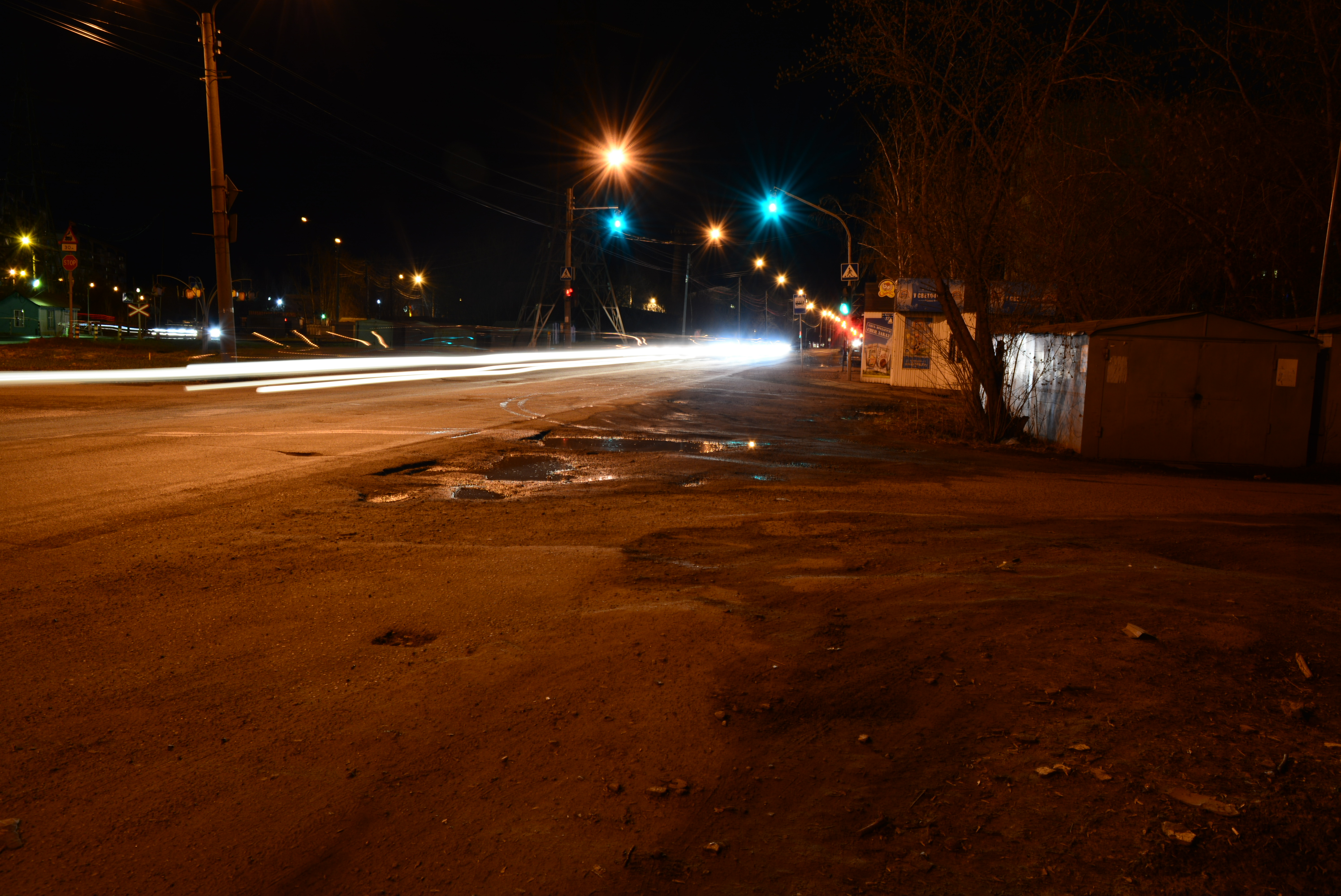 Интересный ночной вид удалось вам сфотографировать. Отлично смотрится перспектива дороги и ритм огоньков фонарей, а при съемке на длинной выдержке удалось эффектно подать движение машин в виде длинных световых следов.