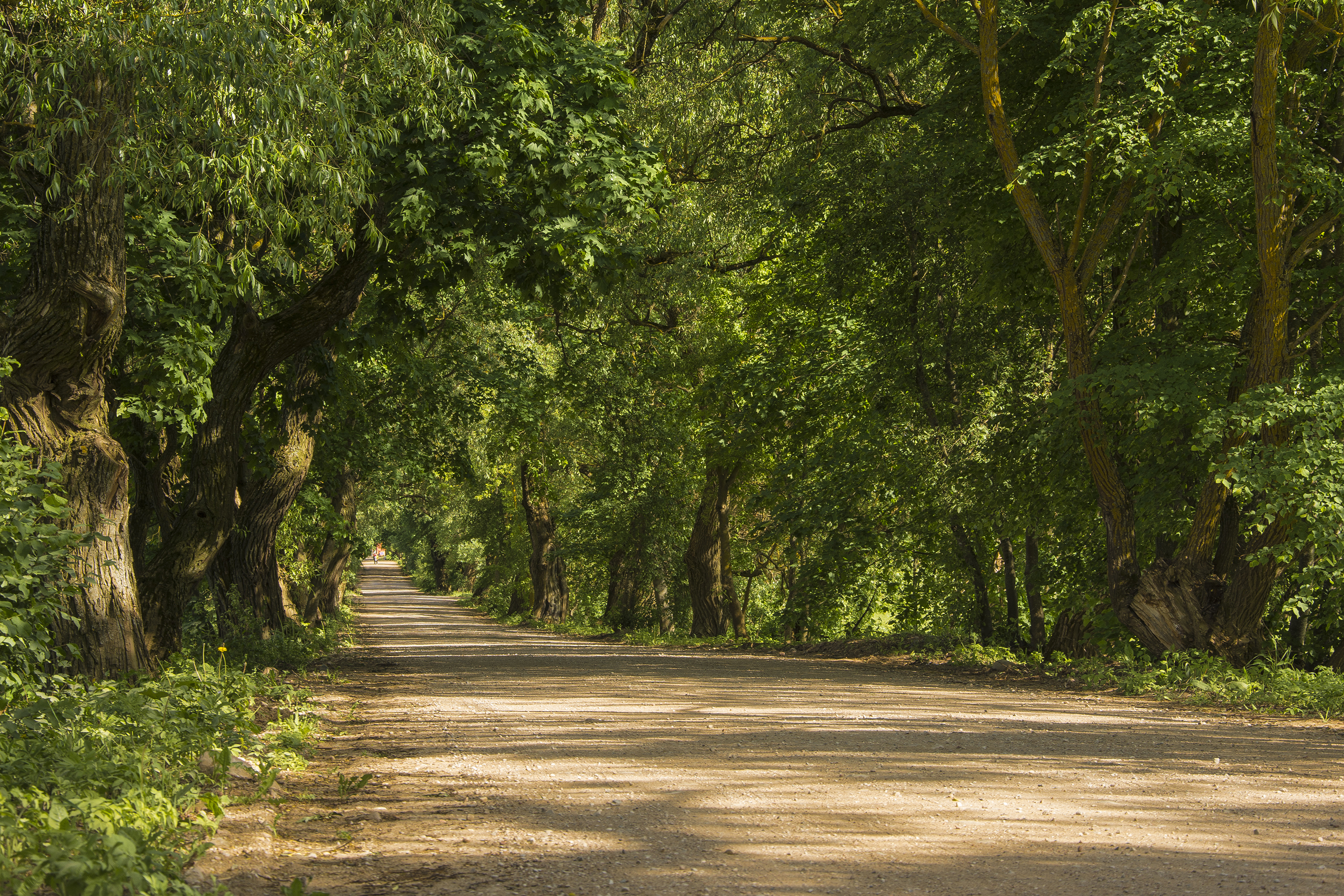 Без замечаний к технике съемки. Да и компоновка хороша. И вот бы еще мальчишек с удочками, бегущих по дороге, или девушку в красном, на велосипеде, мчащуюся по дороге, или просто фигуру автора снимка, стоящего на ближнем плане и что-то высматривающего в кронах деревьев. Можно снять такой кадра с применением штатива и отложенного спуска затвора.