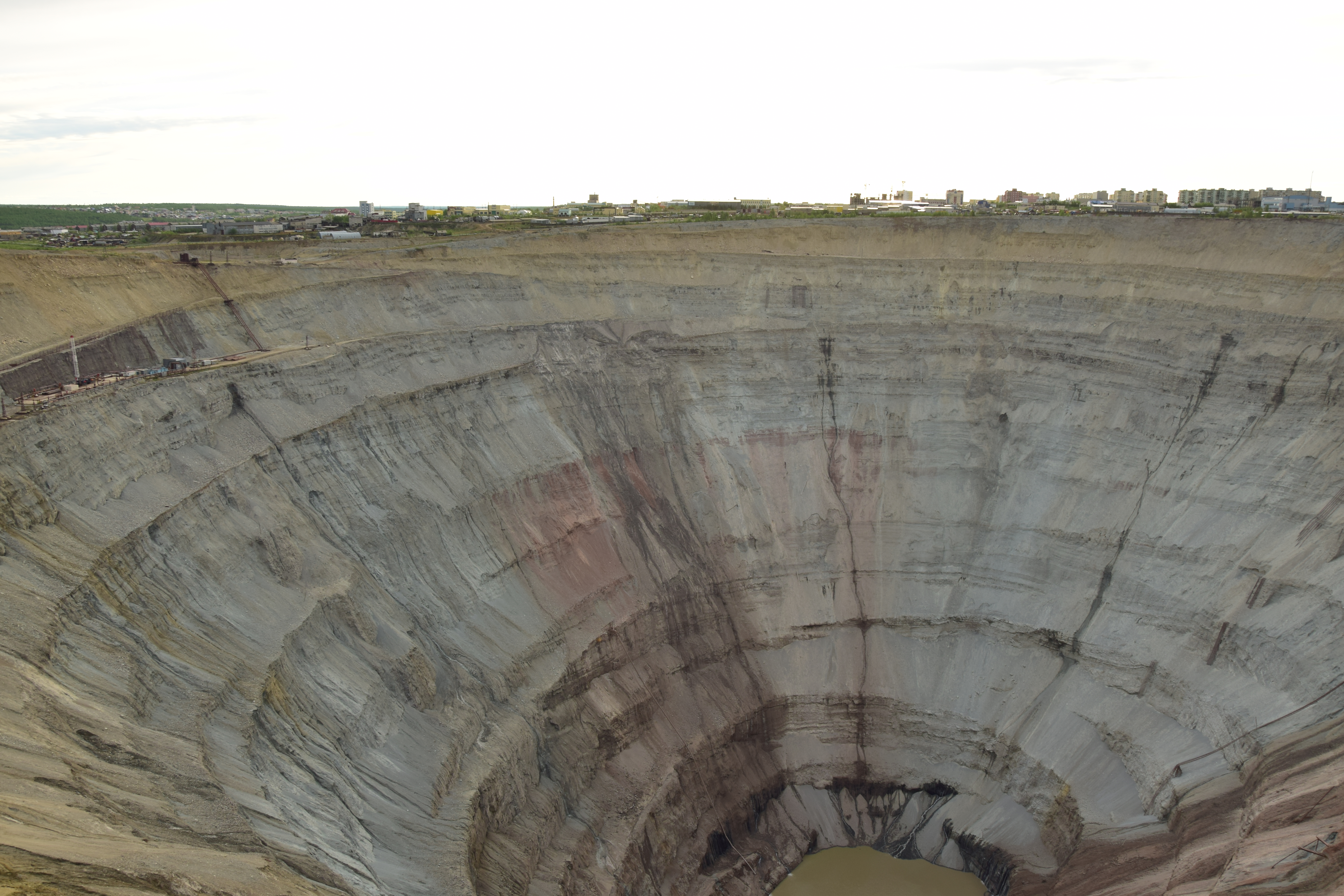 Достопримечательностью нашего города является алмазный карьер "Мир" За ним на фотографии виднеется наш городок. К сожалению небо получилось почему то белым. На самом деле оно было затянуто тучками, из за которых проглядывало солнце.