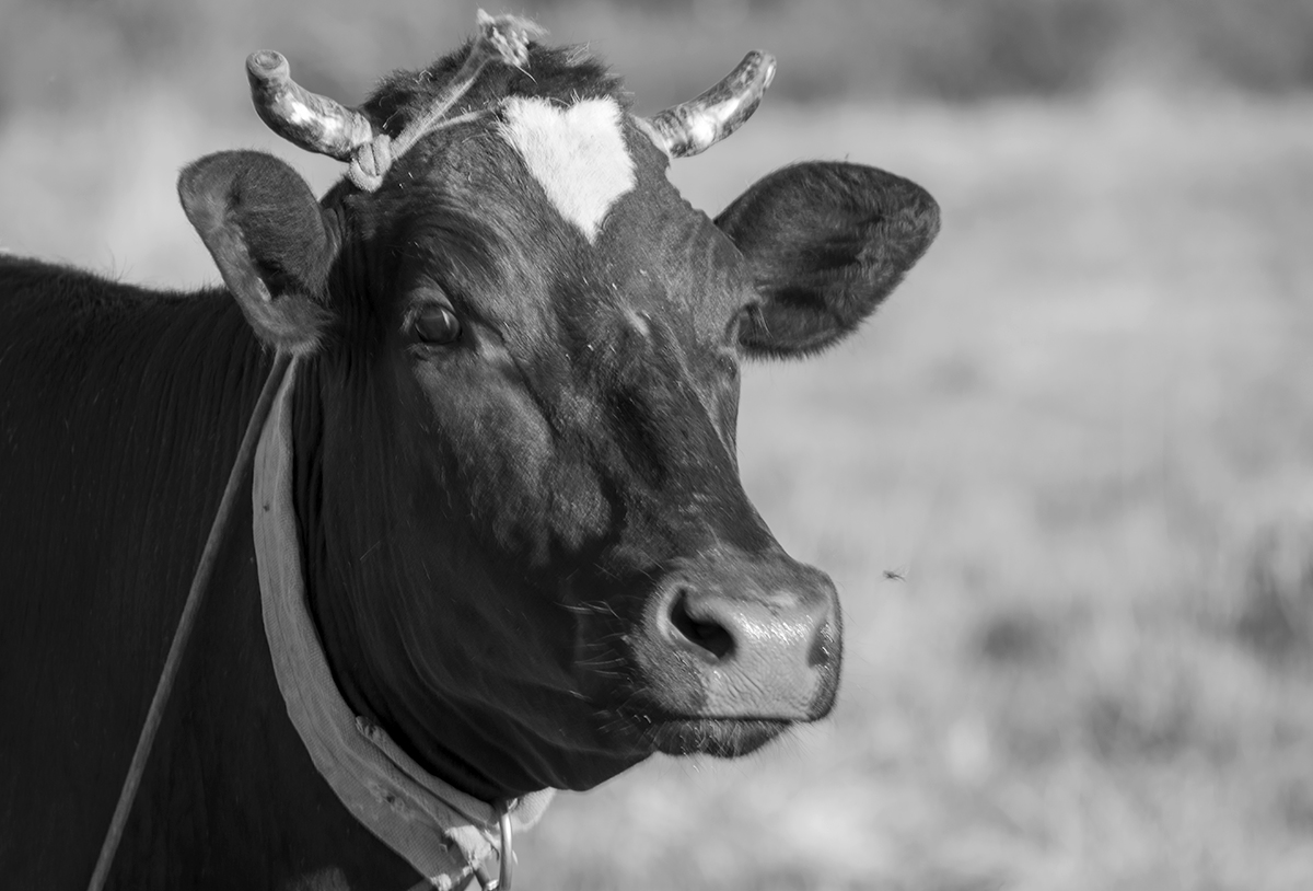 Портрет коровы. Перевела в черно-белый. На мой взгляд так лучше. Сделала выкадровку. Есть минус. Фокусировка не попала на глаза коровы и небольшой смаз у носа. Корова шевельнула головой. Очень сложно уговорить её постоять неподвижно.