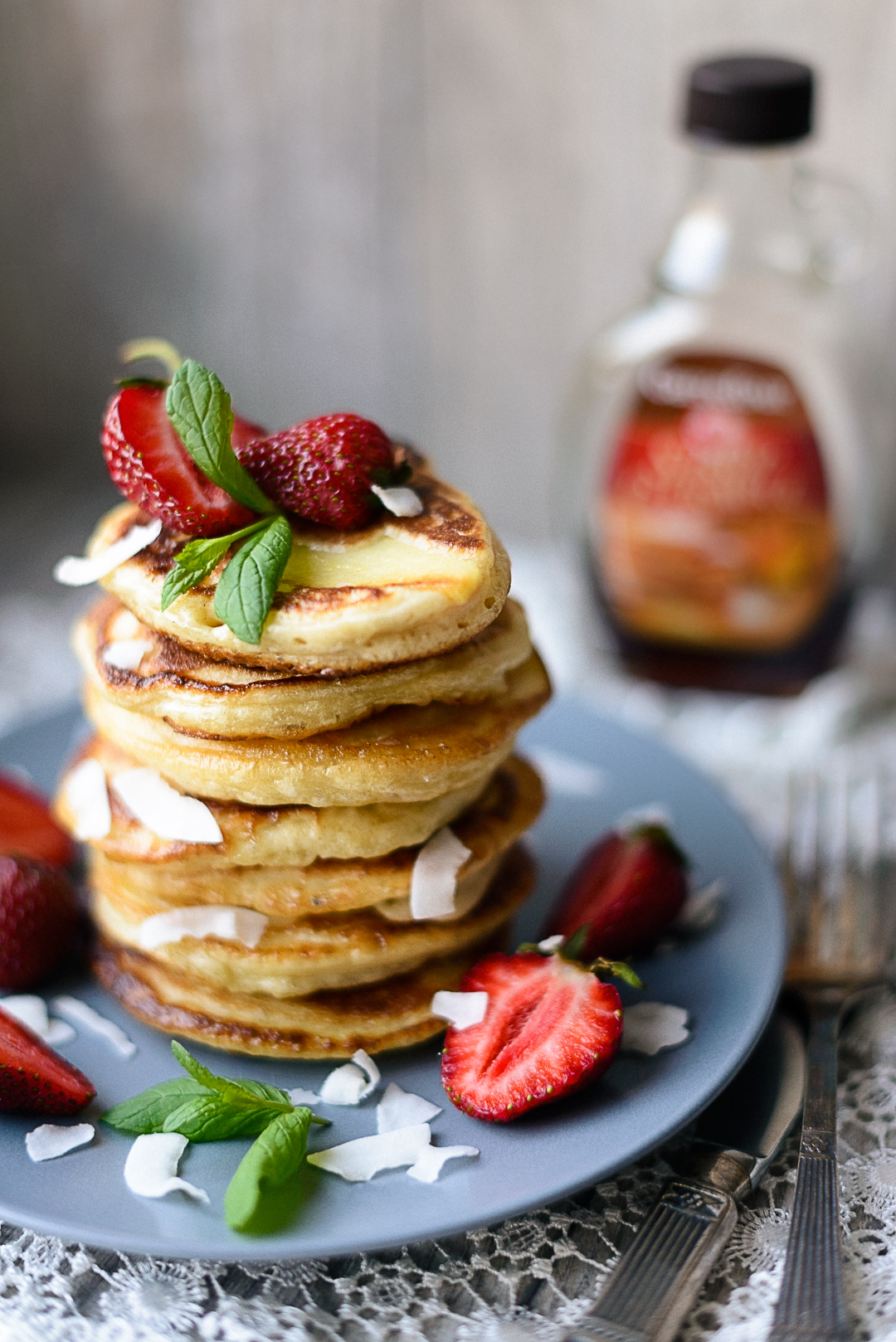 Стайлинг мне дается сложнее всего. На фото запечатлены оладьи, которые захотелось украсить свежей клубникой и листками мяты. Возможно, лишним элементом будут кусочки засушенного кокоса. Но так требовала душа художника :) Для ностальгического настроения тарелку с оладьями я поставила на кружевную салфетку, рядом положила ретро-приборы. На заднем фоне маячит бутылочка с кленовым сиропом. Думаю, она и лаконичная современная тарелка не дают до конца окунуться в атмосферу старины. Как уже писала, хотелось создать небольшой налет ностальгического настроения на фото, но при этом напомнить зрителю, что мы находимся в современном мире.