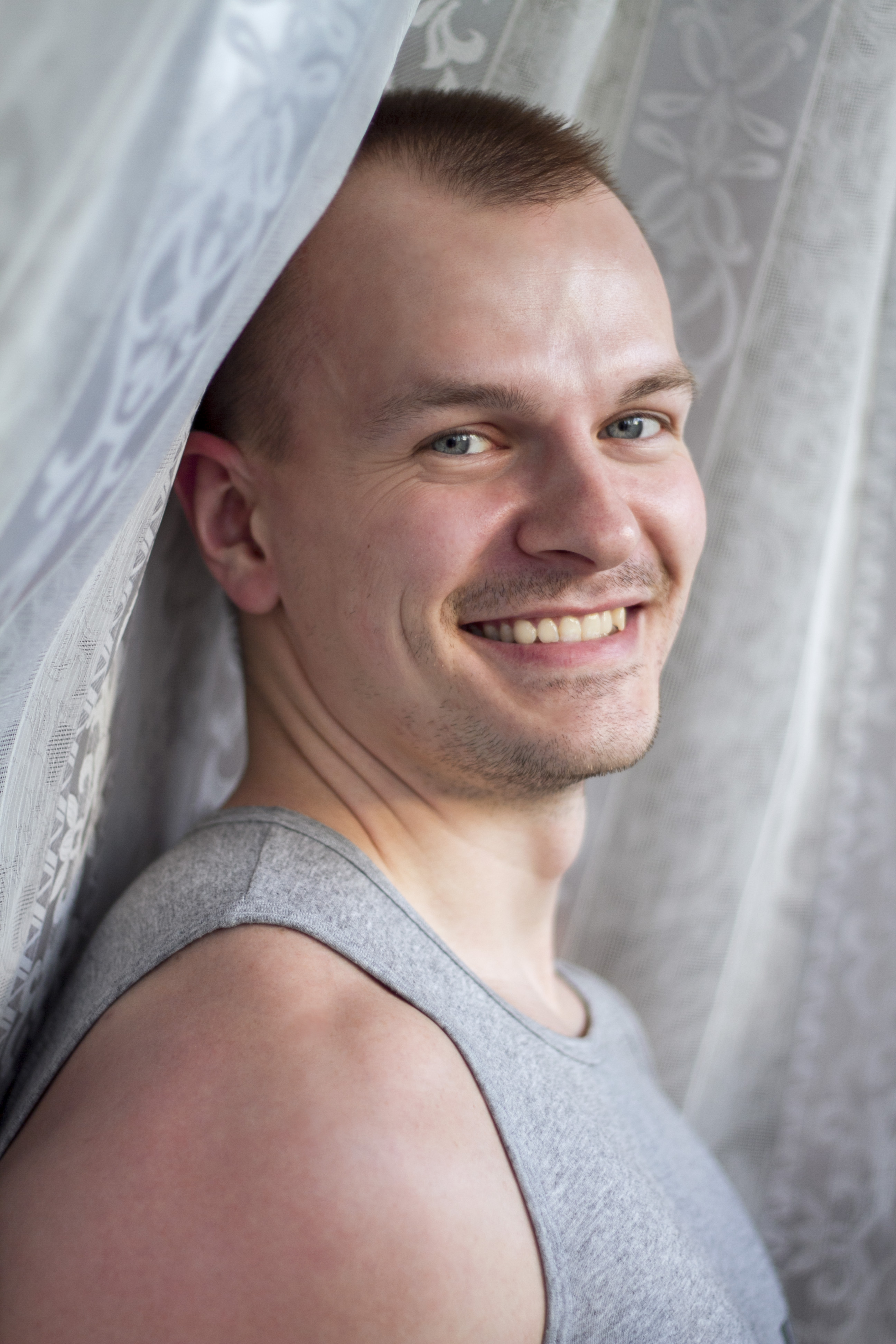 Как вариант, можно было попробовать окно еще в кадр включить, чтобы понятнее смотрелась фотография. Просто штора сама по себе выглядит несколько непонятно и не совсем гармонична мужскому образу. Хотя возможно это субъективно :)