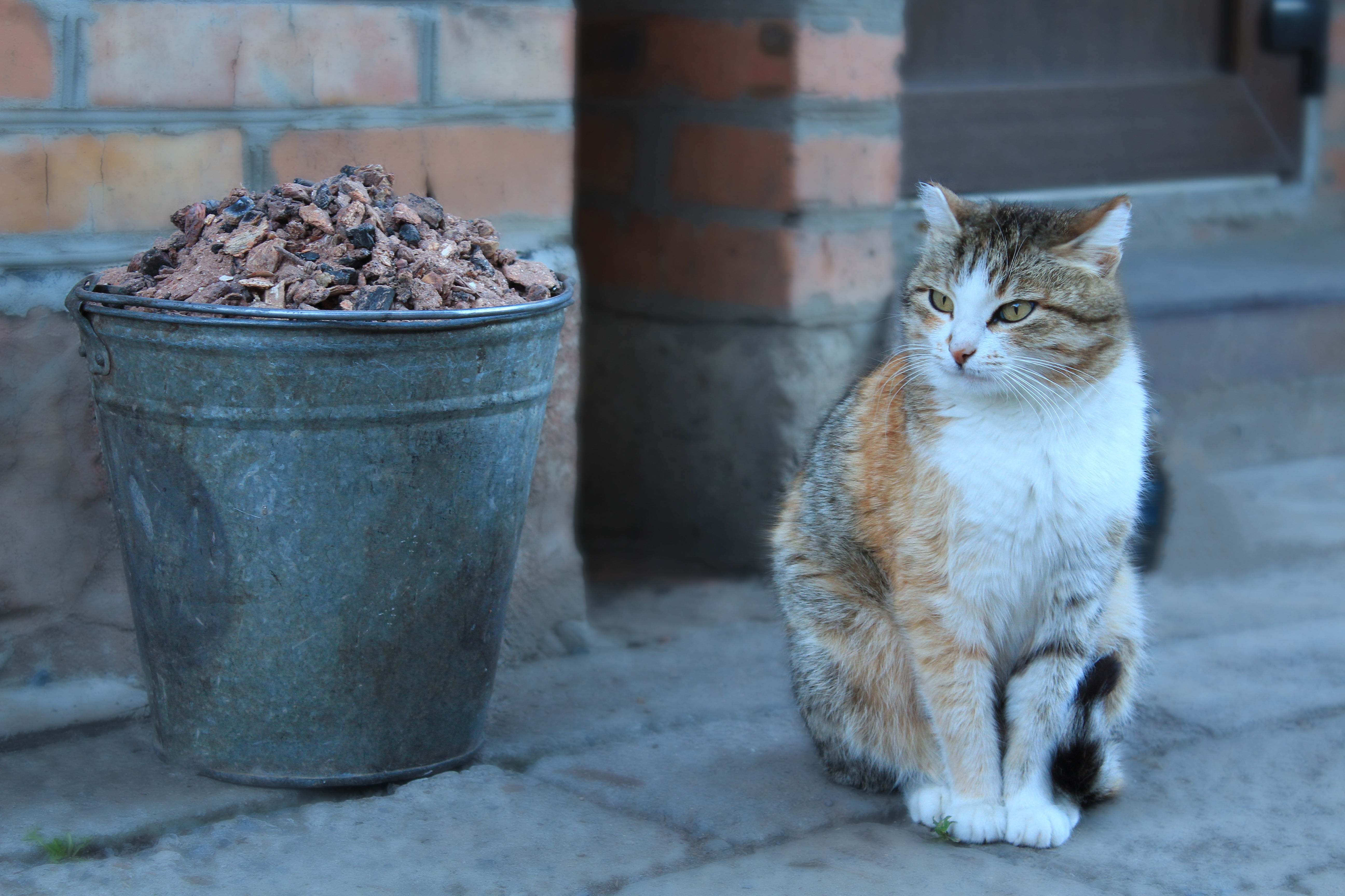 Здравствуйте! Фото сделано в первые дни обучения на курсе, в том краю, куда газовые трубы еще не проложили... Понравился момент. Суровая деревенская кошка и ведро с жужалкой). Что скажете? Не бредю ли я? P.S. Ничего, что смазала фон в фотошопе? Задний план немного мешает, по моему мнению.