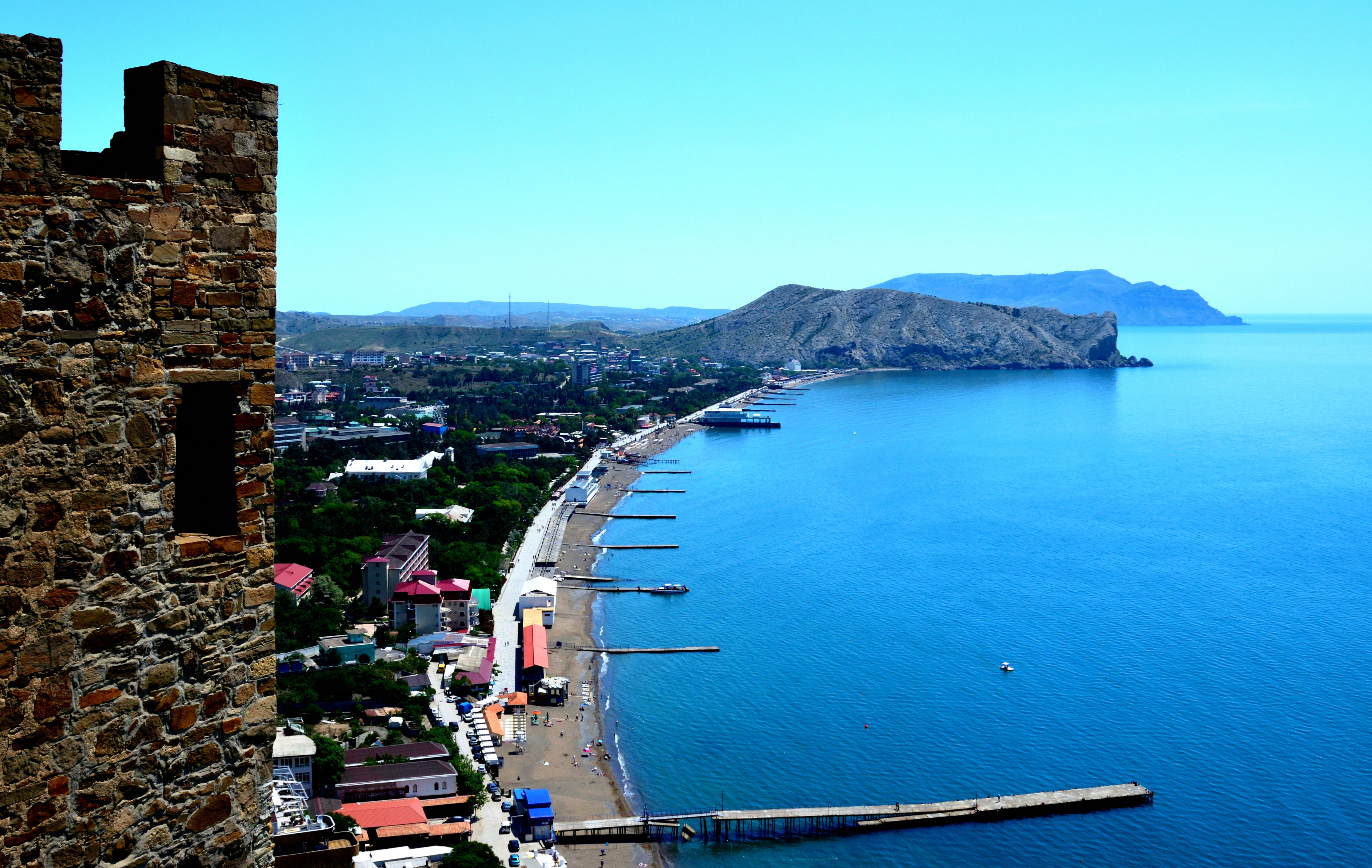 Крепость в переднем плане подчеркивает глубину пейзажа, от нее взгляд перемещается в глубину пейзажа.