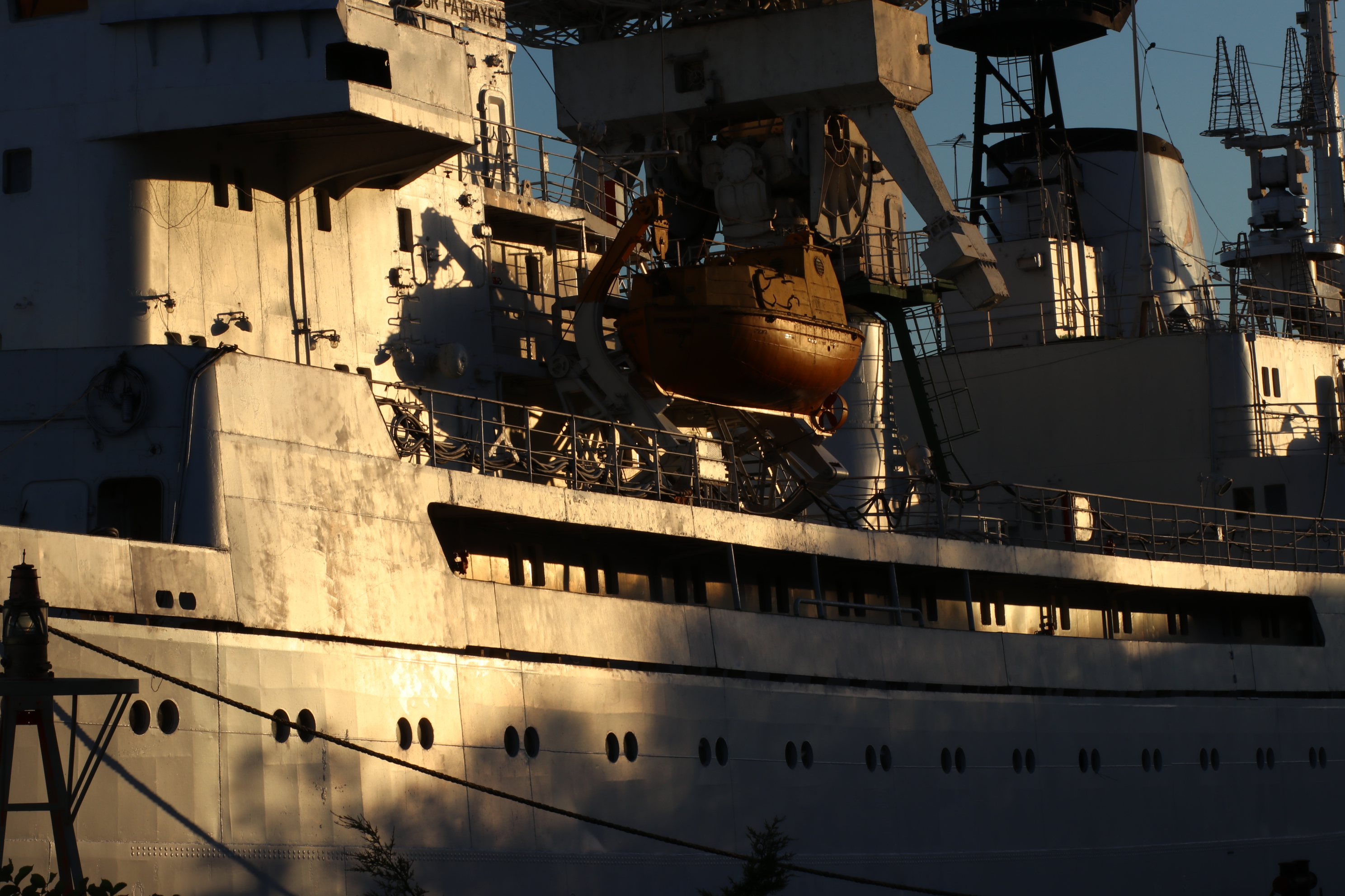 Освещение жестковатое, резкие тени прорисовывают форму корабля, фактуру его борта.