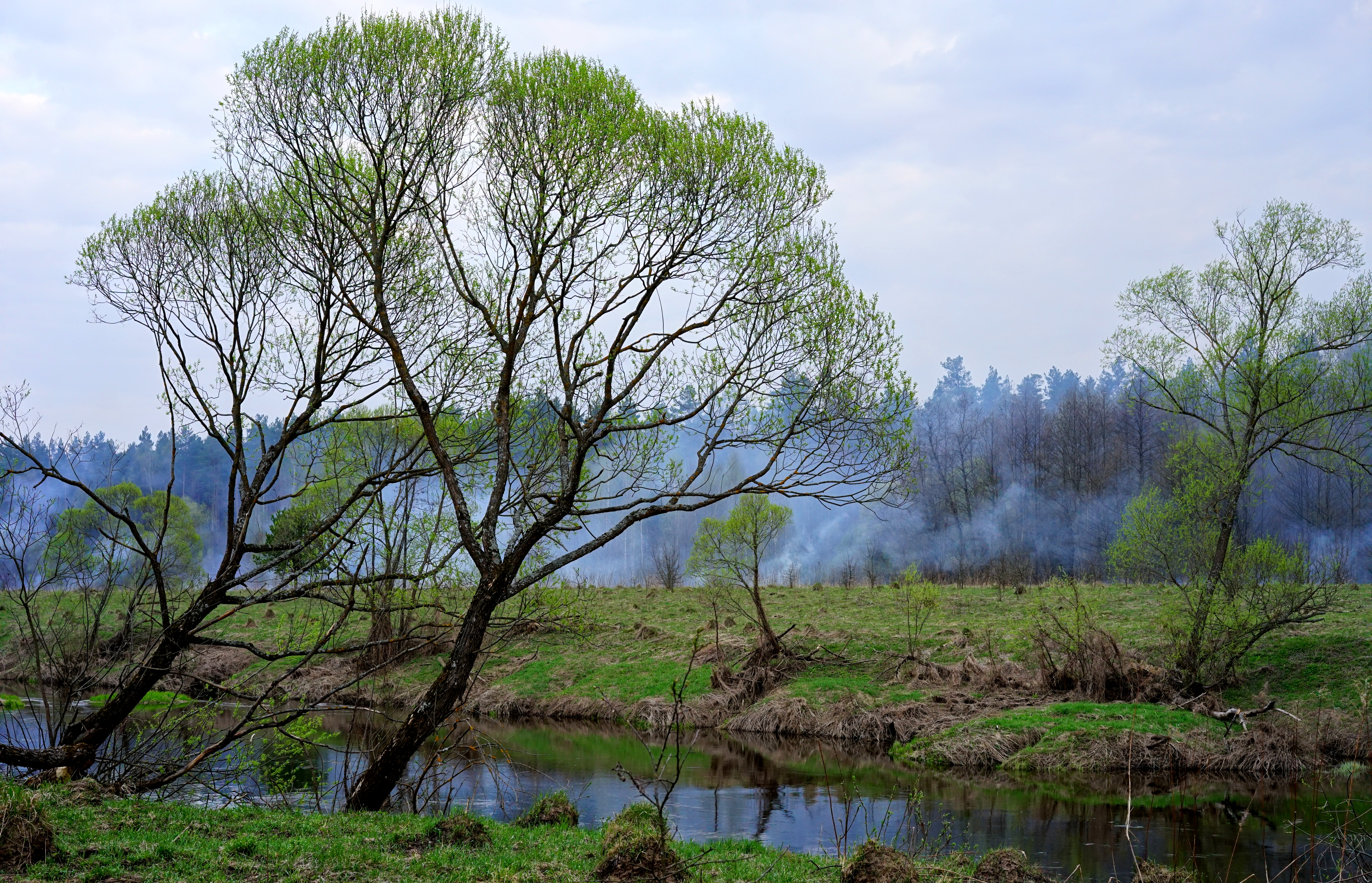 Сплав по р. Ресса Калужской области. Вечерняя съемка со штатива. На заднем плане дым от горящей травы,