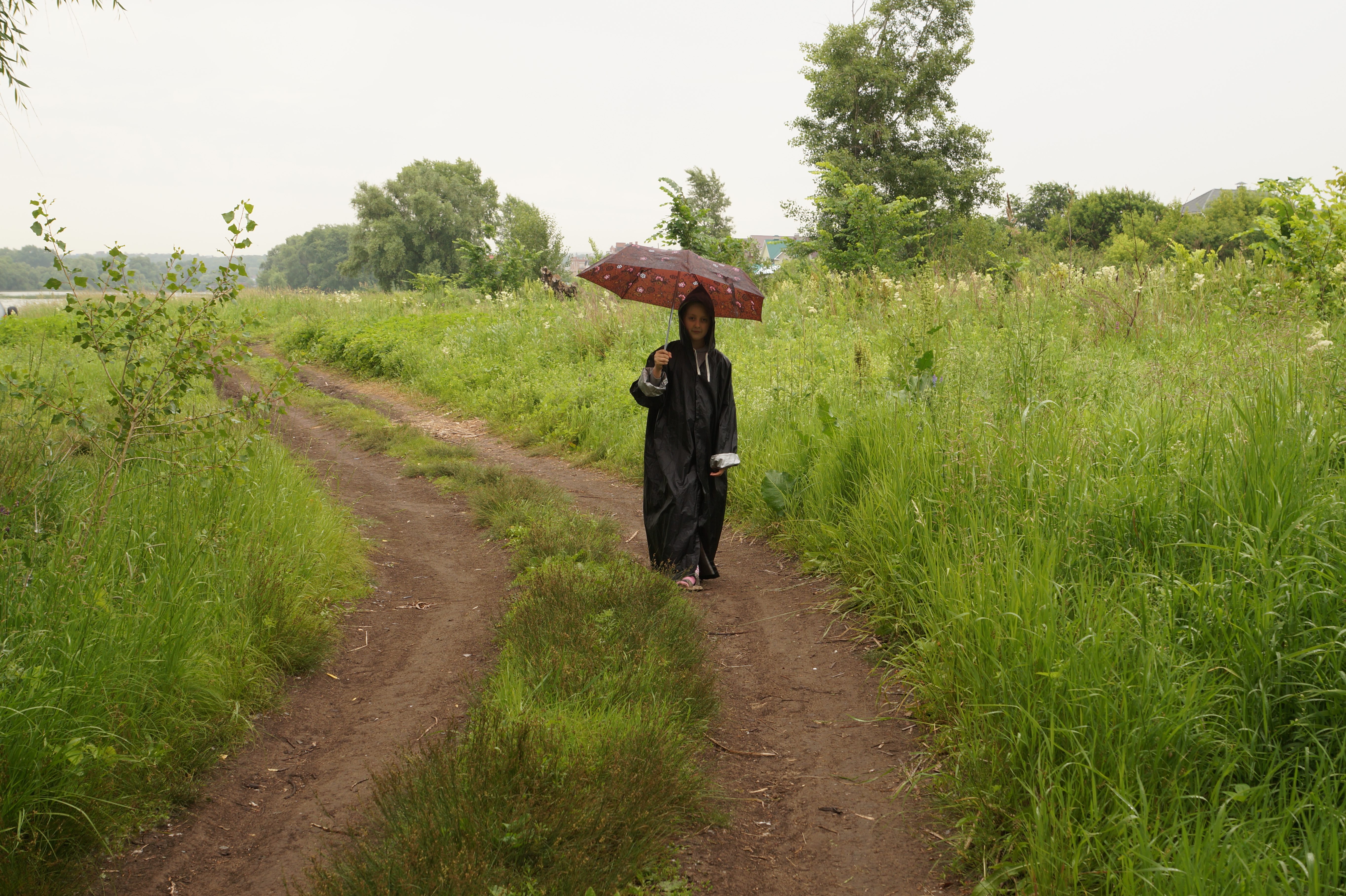 Только можно было только дождевик оставить. И, как вариант, попросить героиню постоять спиной к камере, как будто она любуется пейзажем. И зритель тоже сможет это сделать через нее :)