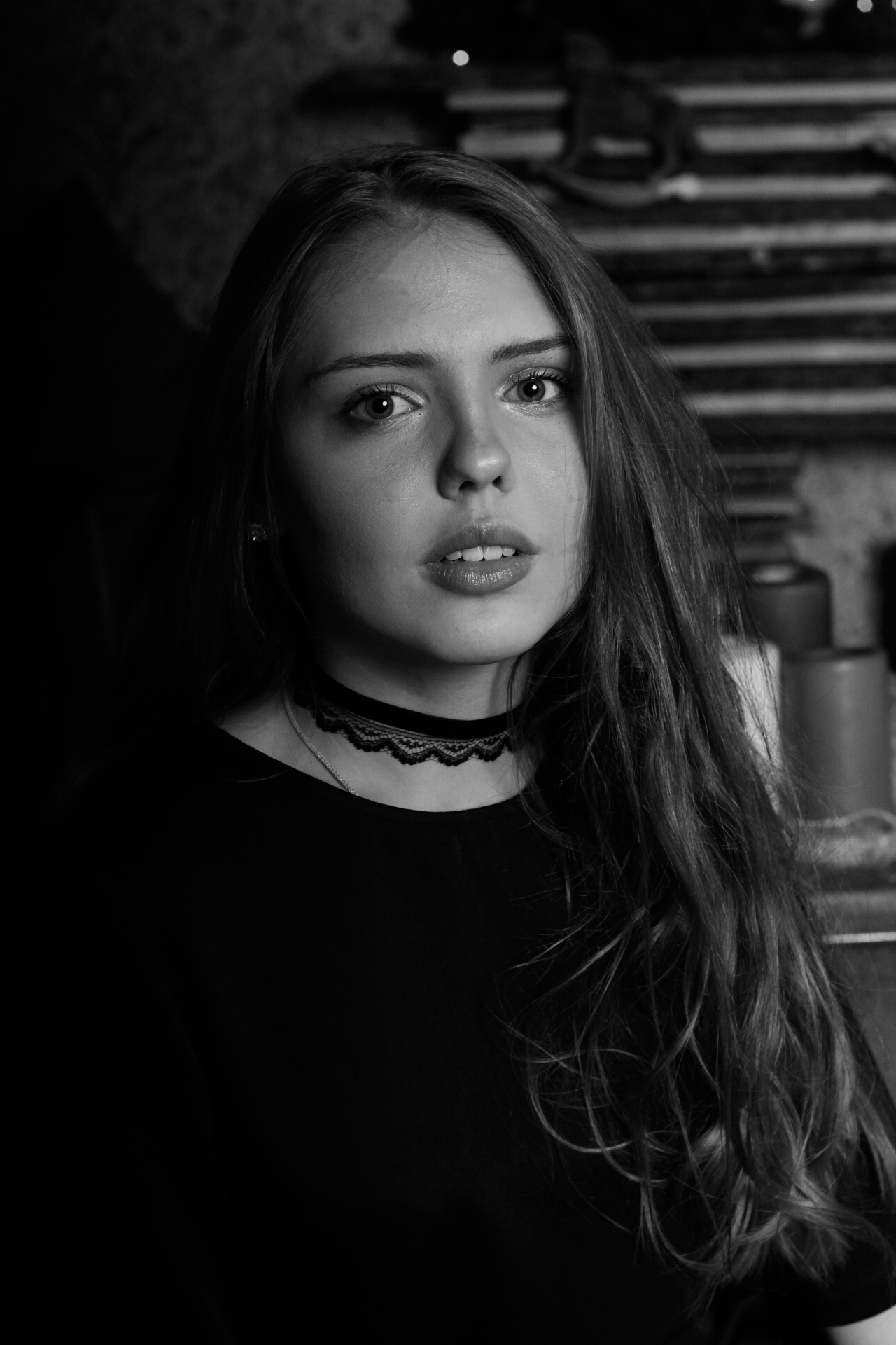 Портрет в низком ключе, облик девушки как будто проявляется из темноты. Густые тени прорисовывают черты лица.