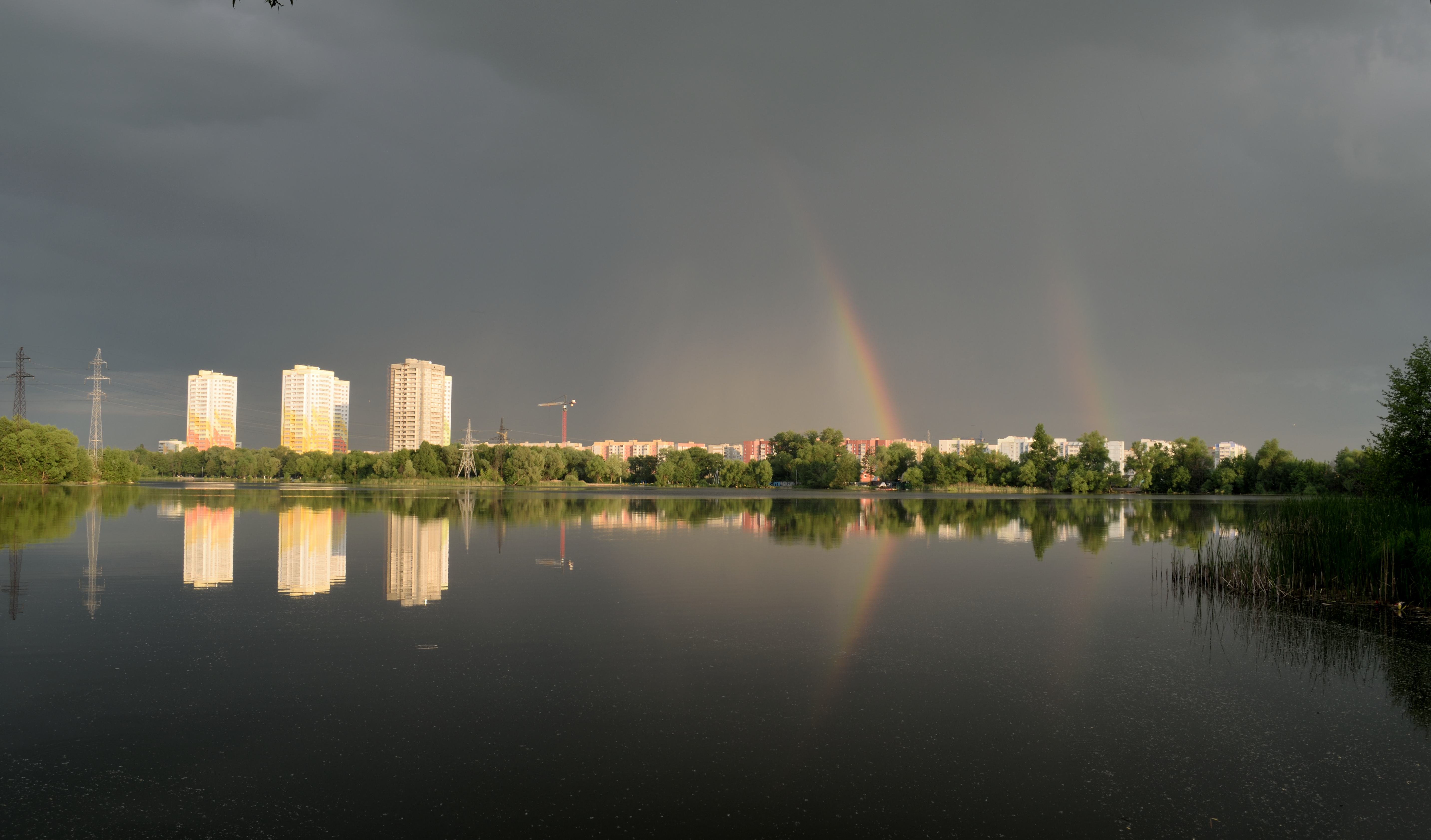 Вы удачно поработали в редакторе. Фотография выровнена точно. И панорамный формат усилил горизонт. Правильно сделали, что сам горизонт сместили немного ниже середины кадра. Радуга отлично дополняет фото.