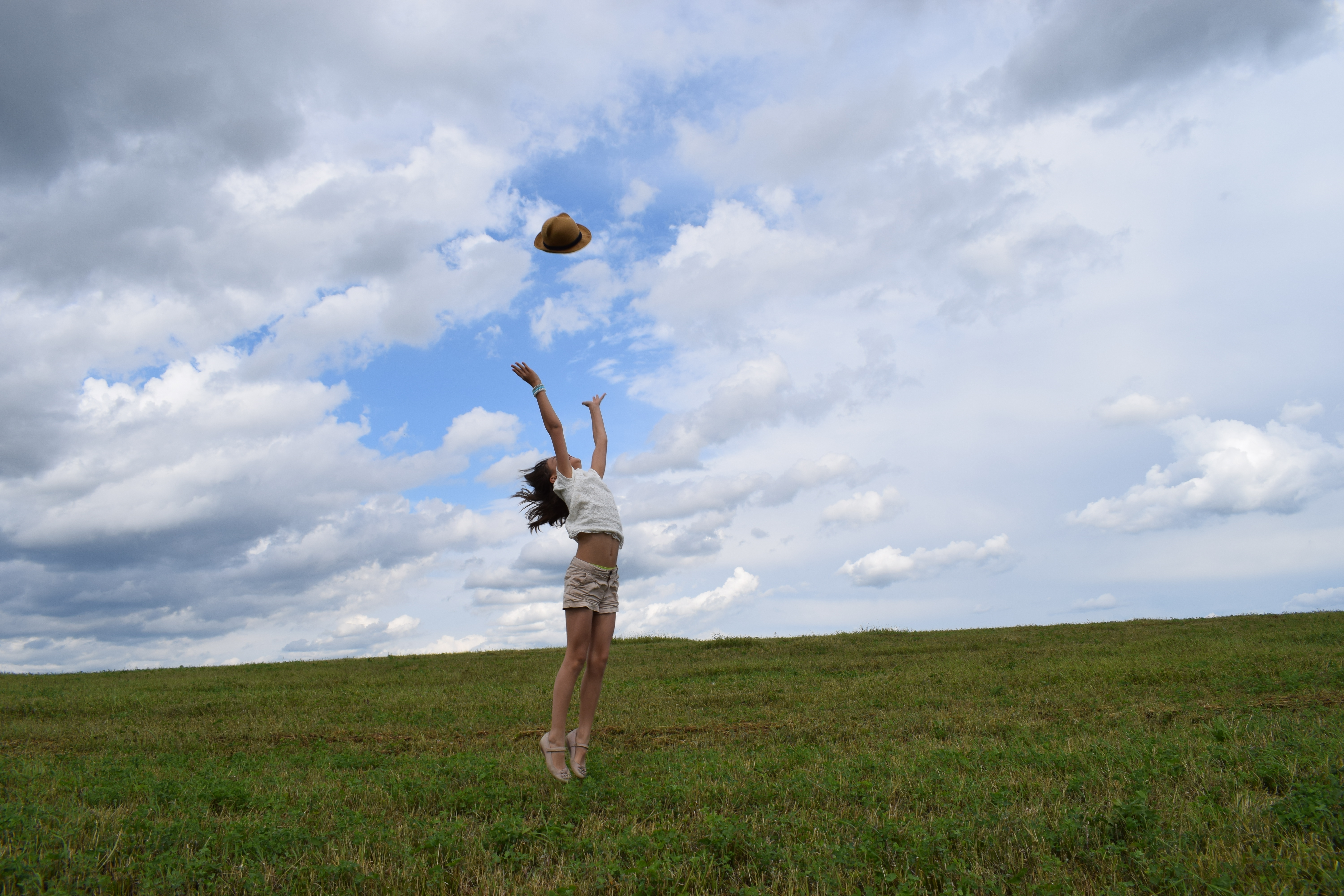 Отличный динамичный кадр у Вас получился! Очень здорово поймали фазу прыжка. Руки и шляпа выгодно вписались с просвет между облаками. Сами облака смотрятся очень эффектно.