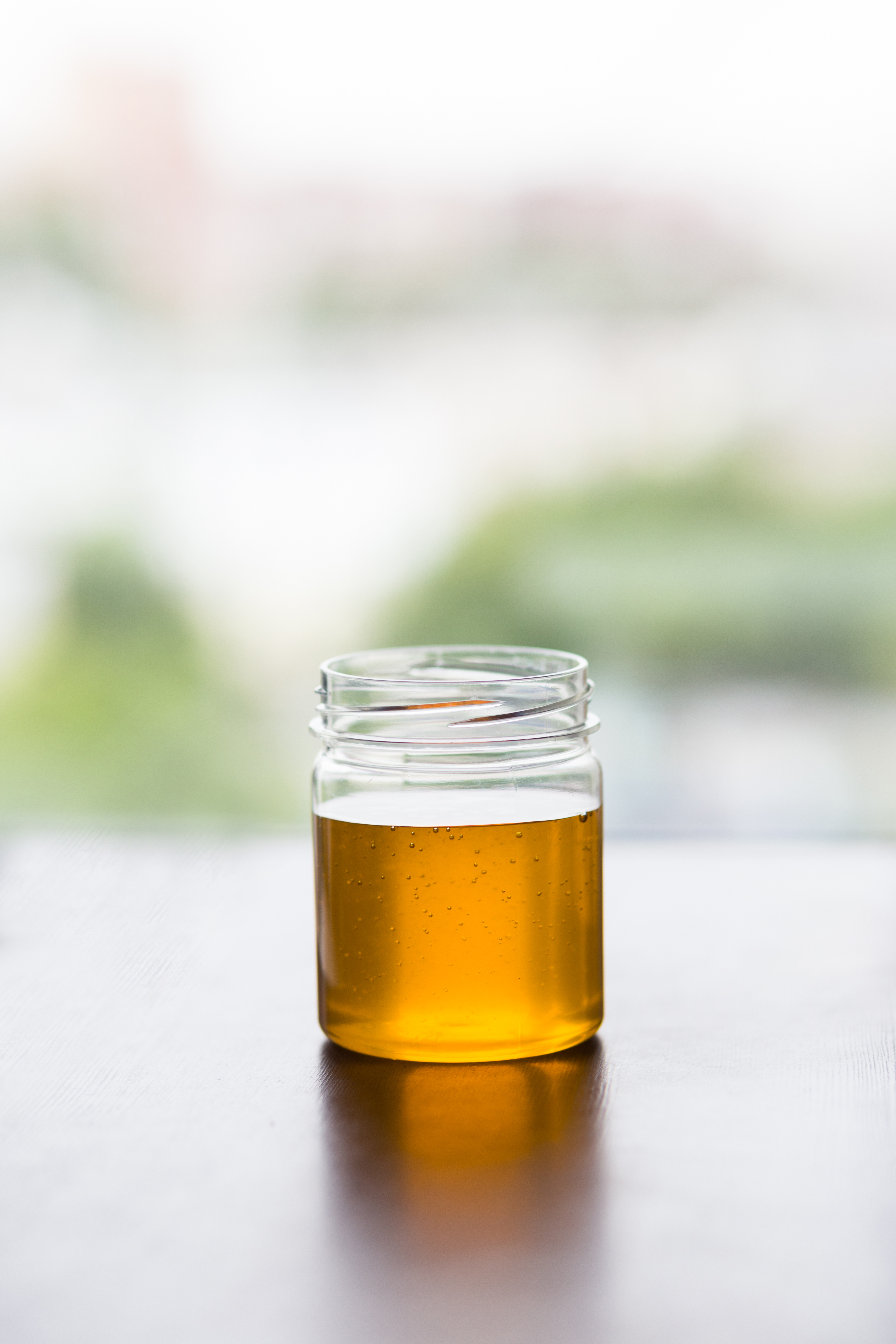 Снимите мёд в прозрачной ёмкости в контровом свете напросвет. Для этого источник света (окно) должен находиться точно позади объекта, оптимальный ракурс — от 0 до 20 градусов. В качестве нижнего фона можно использовать подоконник или поверхность стола. В первом случае объект съёмки будет максимально близок к источнику света, мёд получится максимально прозрачным. Во втором случае — контрастные переходы теней и светлых областей сравняются, общая световая картинка будет более однородной.