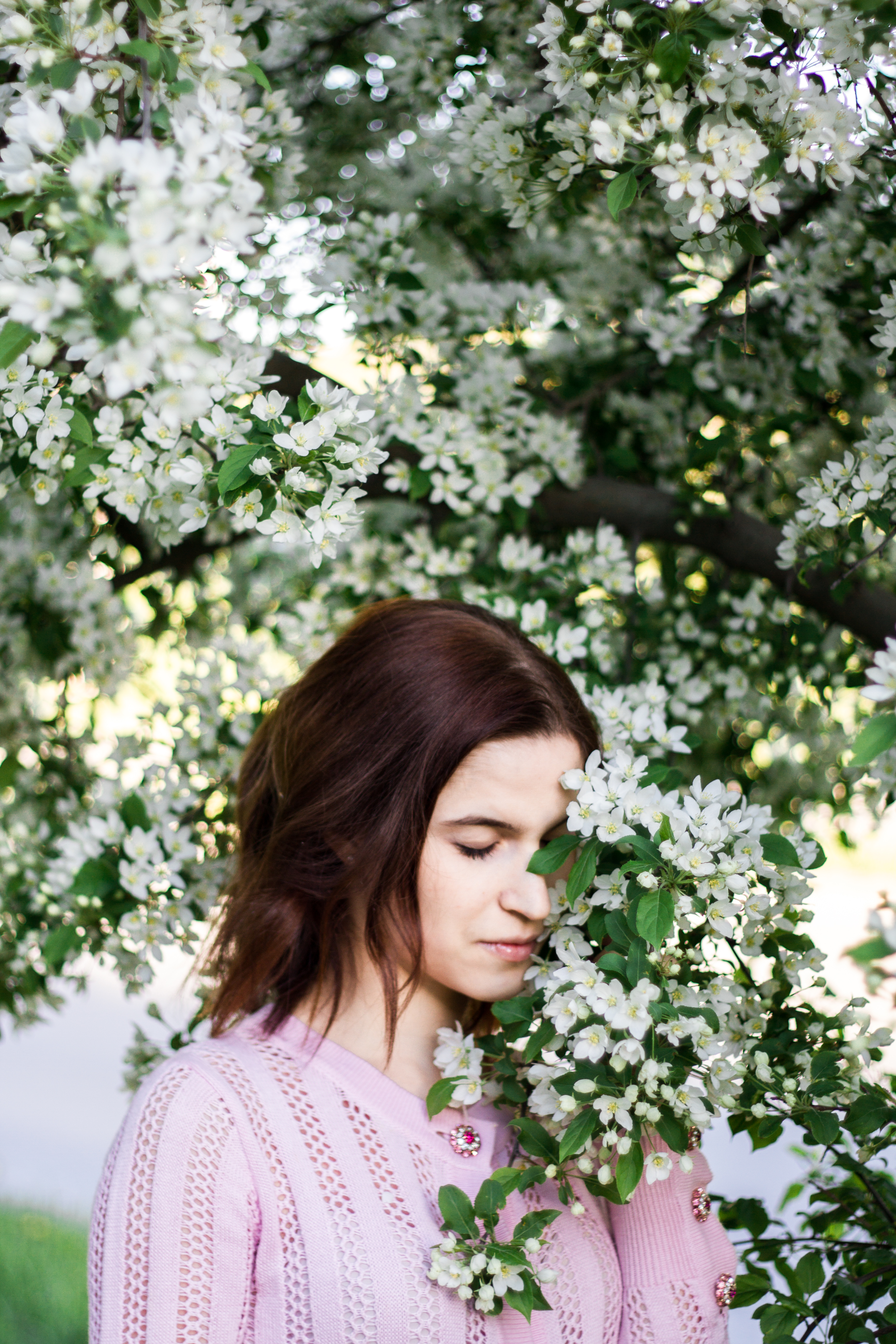 Стоило попросить героиню дальнюю руку опустить, а ту, что ближе к камере поднести к цветам. Так бы поза смотрелась понятнее и гармоничнее :)