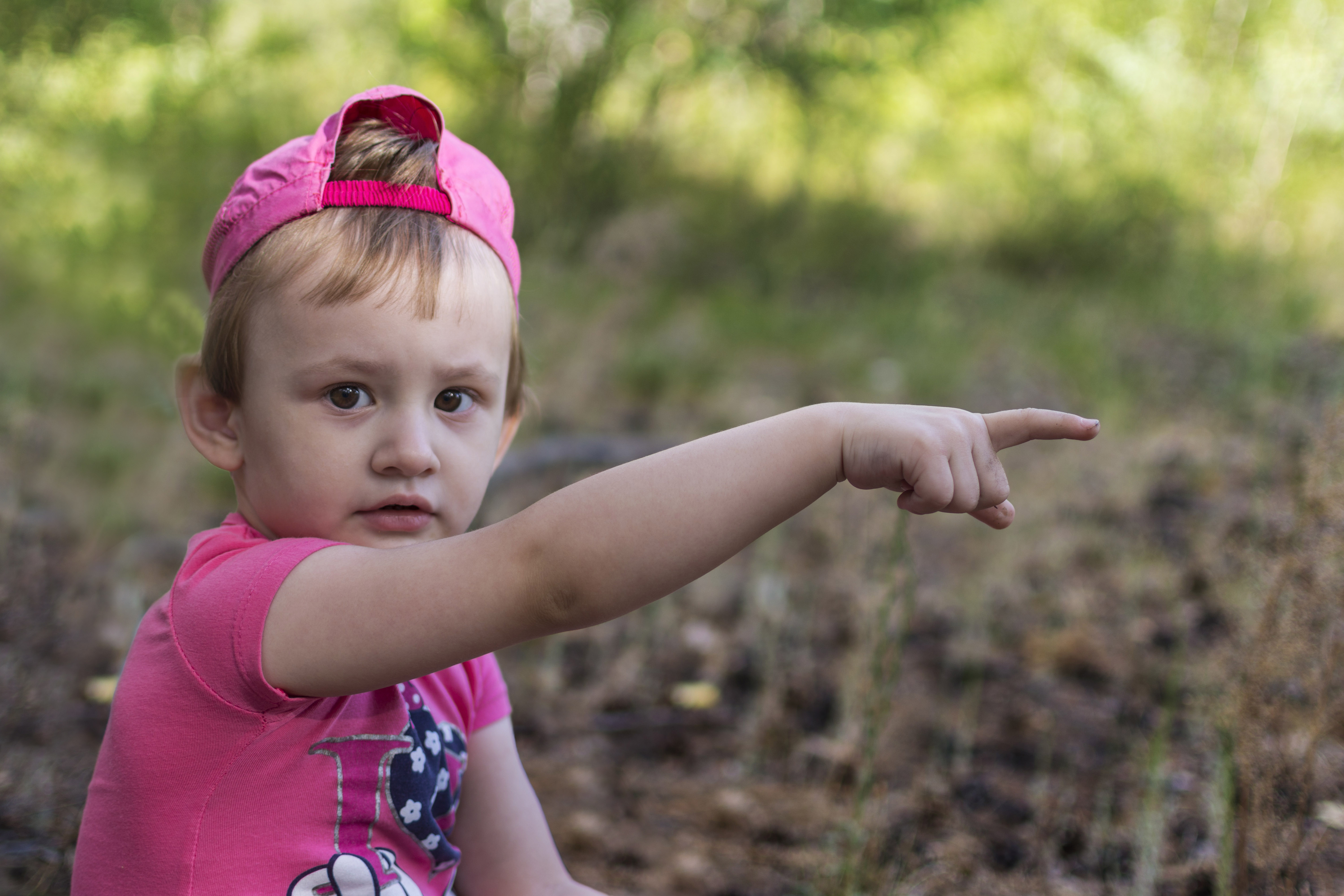 Кроха выразительно указывает рукой фотографу на место за пределами кадра.