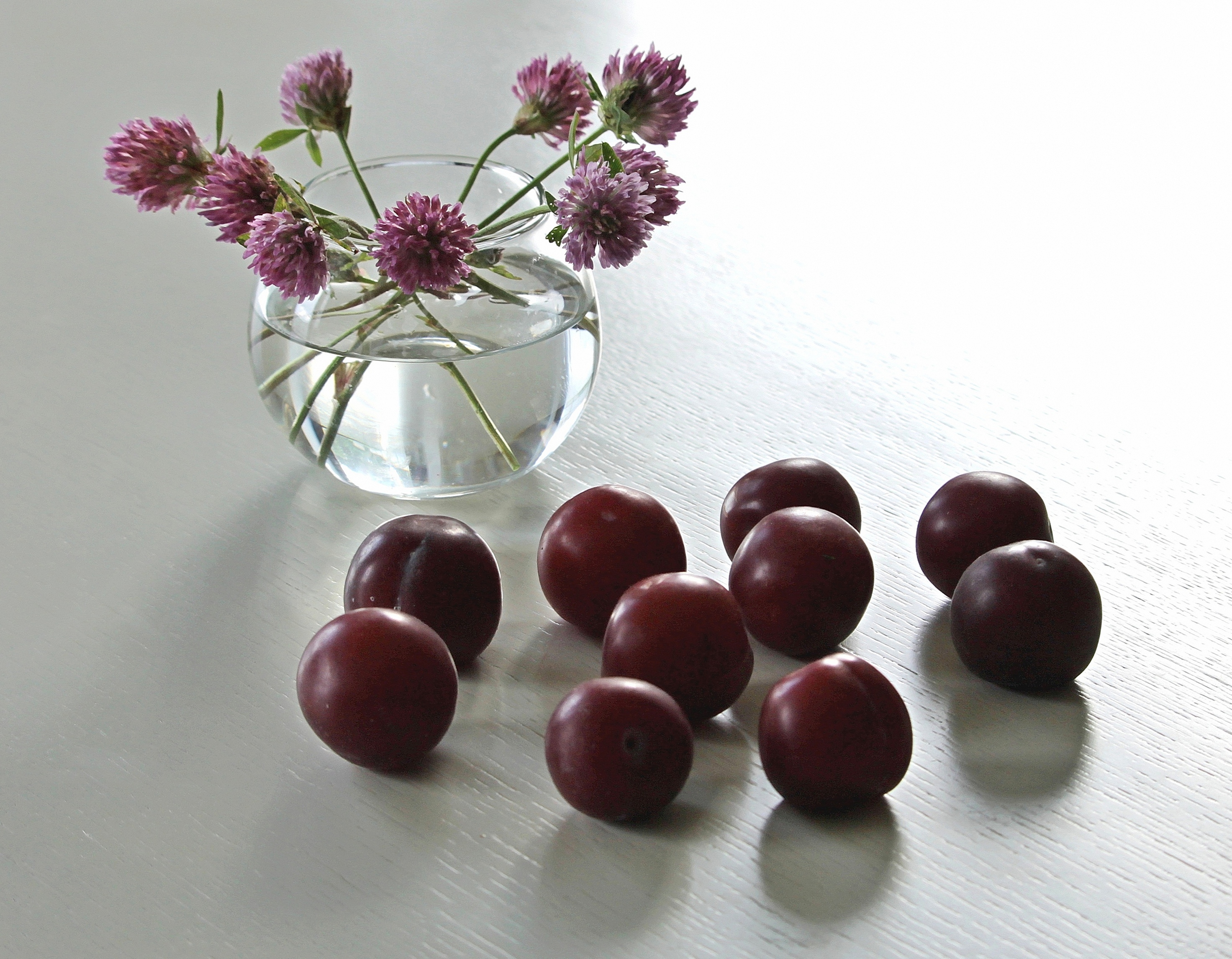 Задание к уроку №3. Натюрморт со сливами. Решила попробовать снять в режиме "Manual". Выдержка 1/60, iso 100, F 5.6. Снято на фоне белого стола. Освещение здесь сразу от трёх окон, расположенных под углом. Задача стояла подобрать какие-нибудь цветы в тон цвету слив.