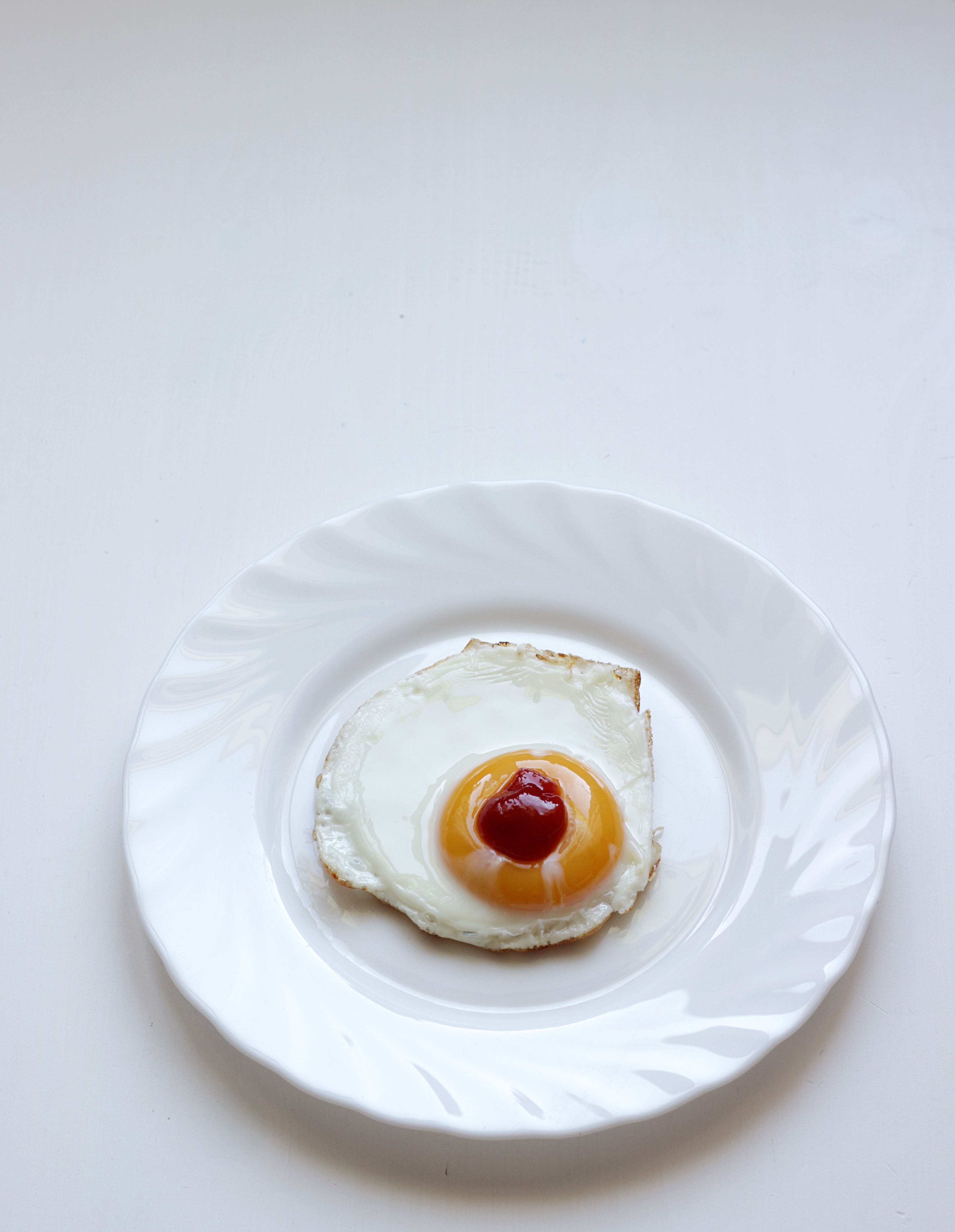 Желток с каплей кетчупа выступают яркими акцентами на фоне белой тарелки и белого фона.
