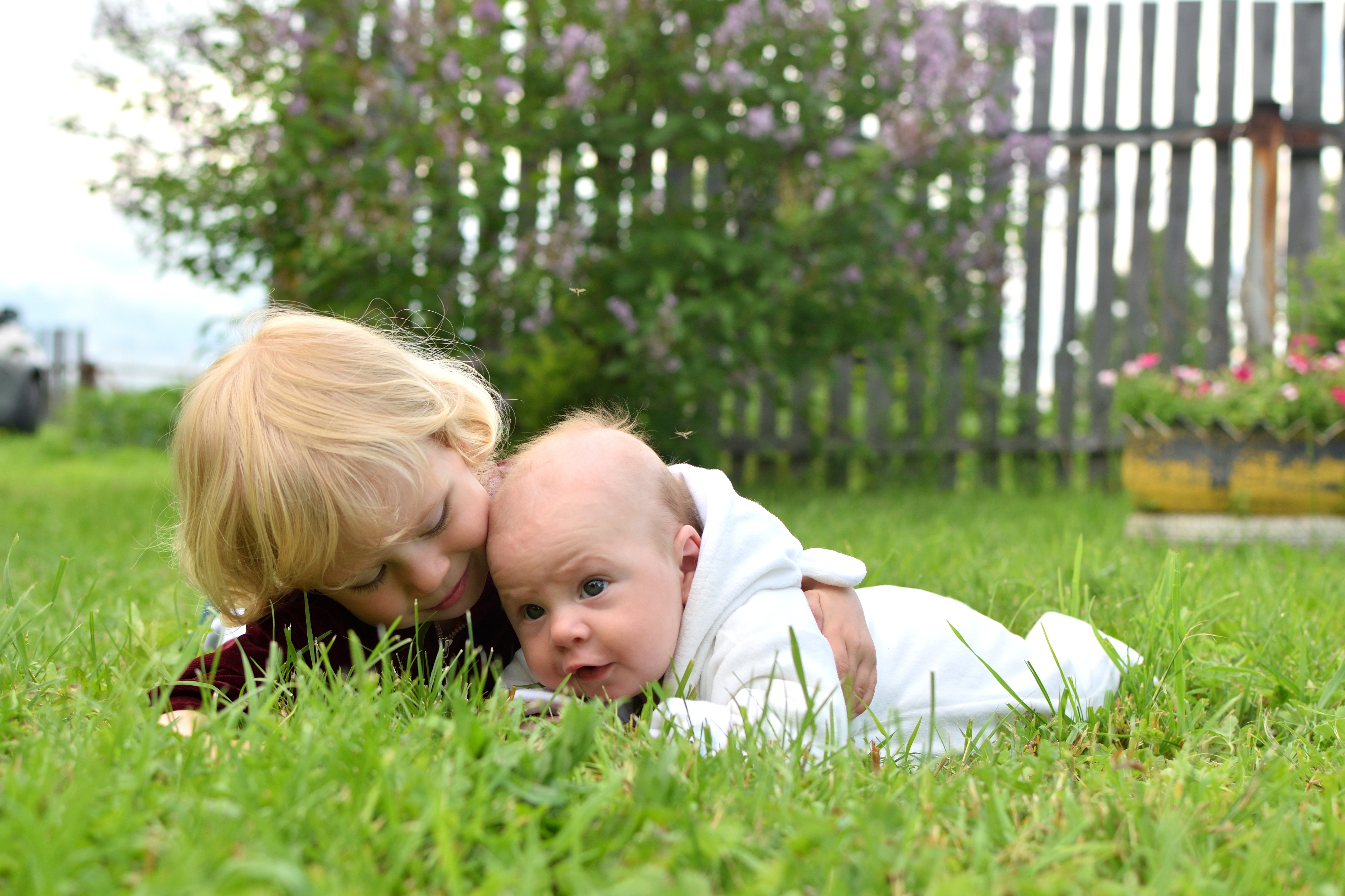 Камера расположена на одном уровне с малышами, здесь сестренка нежно обнимает своего маленького братика. Снимок сделан в режимное время, при этом солнце спряталось за тучку. Диафрагма прикрыта до 3,5 - подходит для такого крупнопланового группового портрета, где детки практически на одинаковом расстоянии от камеры.