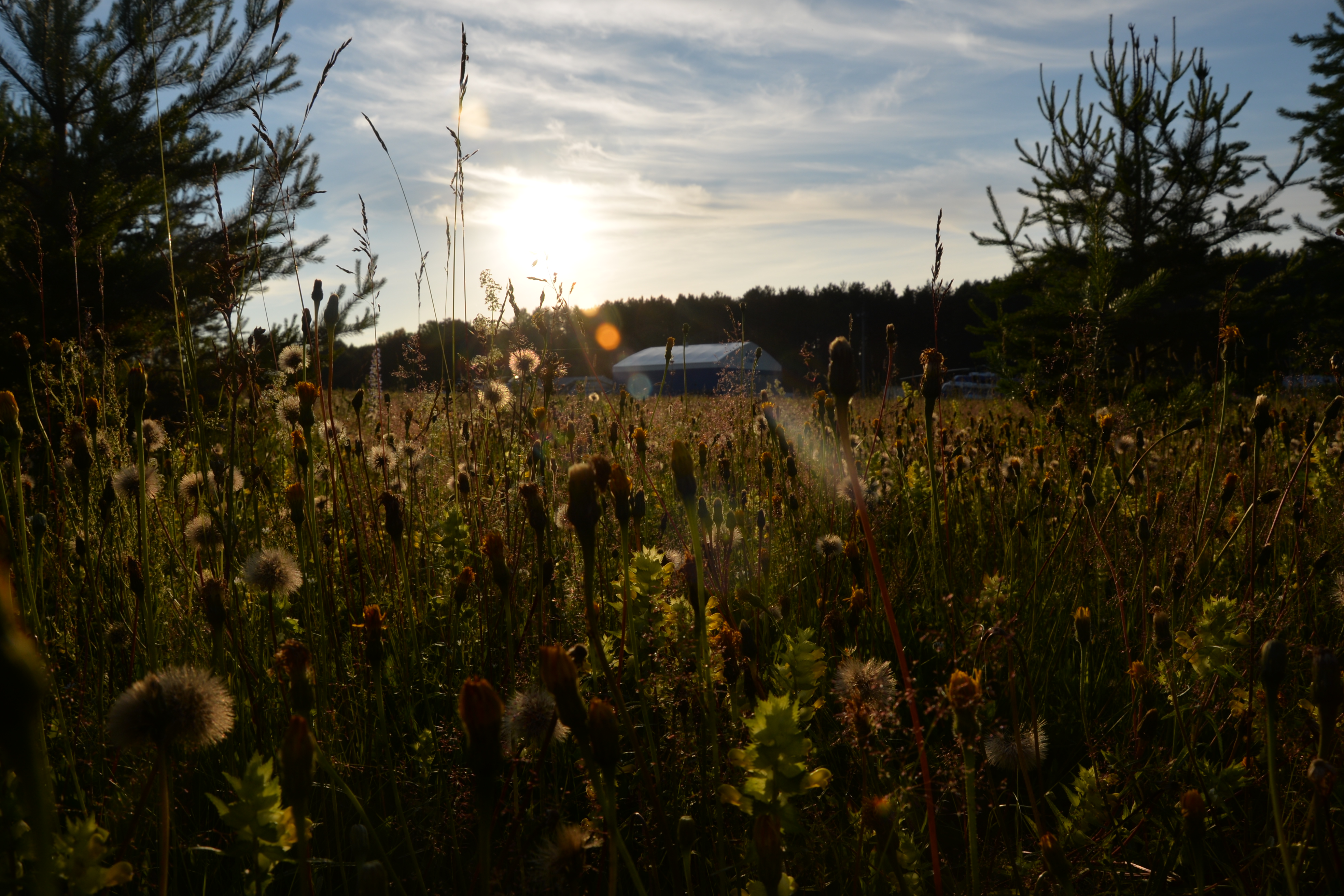 Основное внимание в сюжете уделили цветущему полю, подняв горизонт к верхней трети кадра.