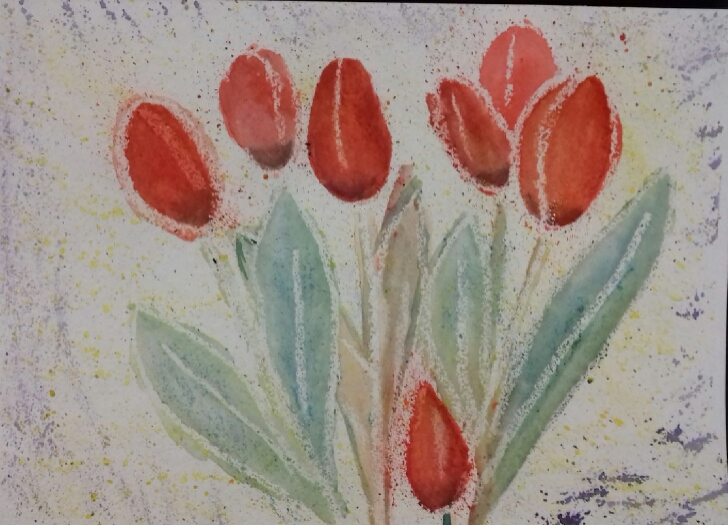 Брызги у Вас получаются. Оттенки нежные. Есть ритмика: бутоны на разном уровне, с разным наклоном. Восковые линии оживляют этюд.