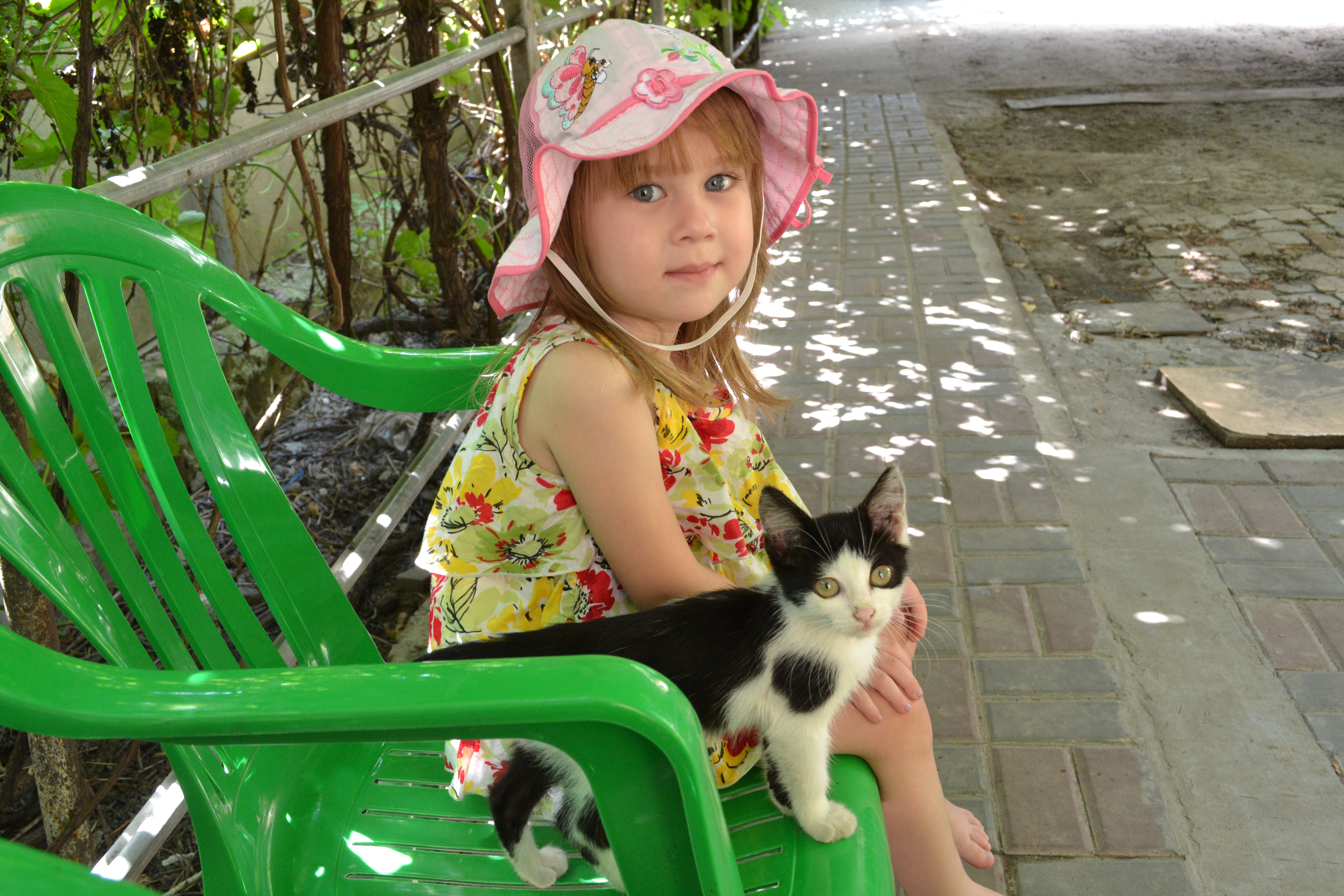 Очень хорошо выбрали момент и девочка и кошечка смотрят в камеру.