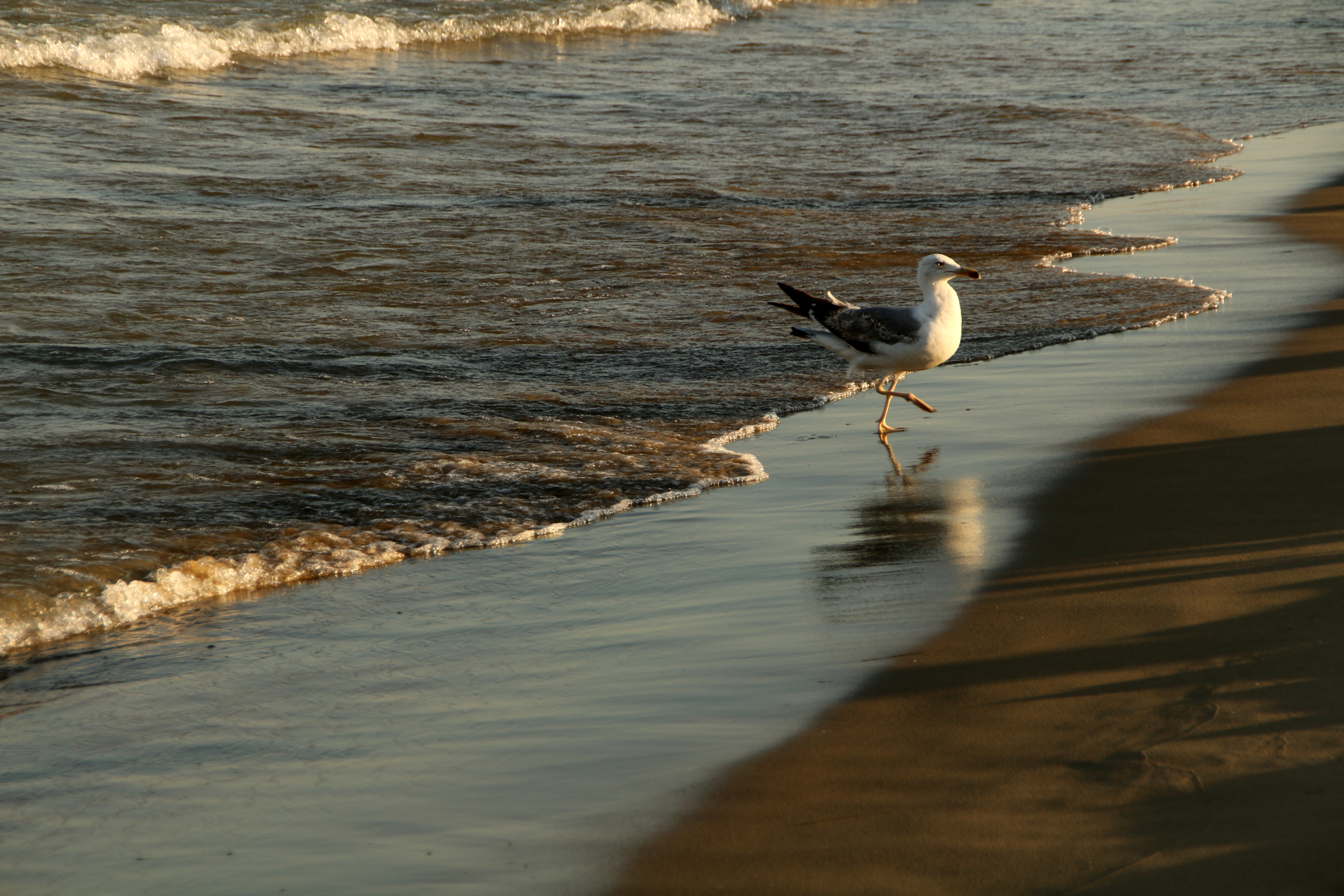 Про чайку.... Боковой свет в режимное время съемки, мне кажется, хорошо передал фактуру воды и влажного песка Понравилось отражение птицы на влажном песке