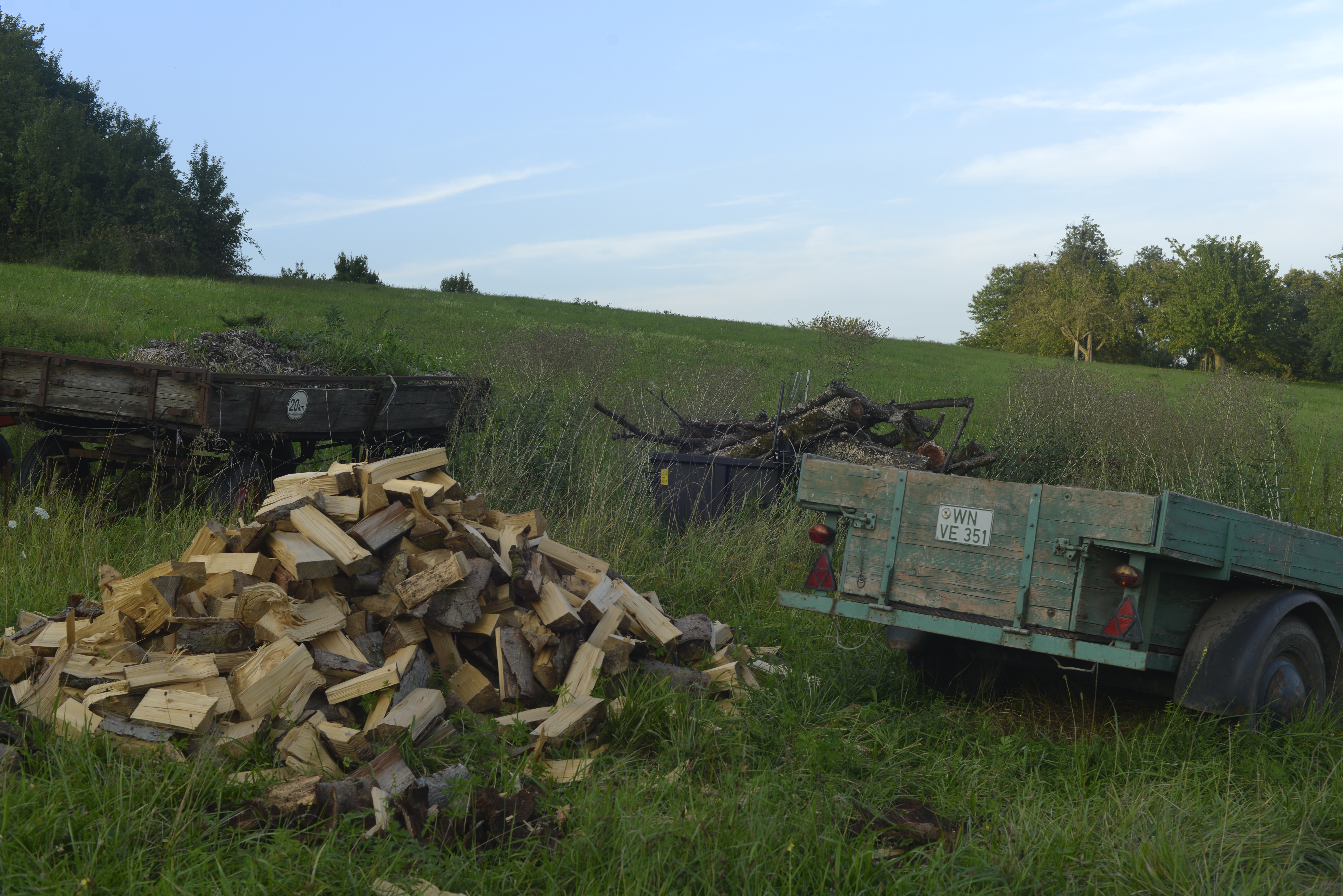 предметное содержание: Перед нами деревенский пейзаж. На переднем плане дрова с прицепом, на заднем деревья. Преобладание светлого/тёмного: На фотографии преобладают светлые тона. Контраст: фотография неконтрастная. Цвет: На фотографии преобладает зеленый цвет с выделением желтых дров и голубого неба. Статика/динамика: кадр является статичным. Главное/второстепенное: Главное - это дрова и прицеп, поле же просто дополняет кадр. Ощущения, ассоциации, эмоции, вызываемые кадром: Складывается ощущение незаконченности, как будто человек пришел, бросил всё дело и ушел, даже не загрузил дрова в прицеп. Также просматривается жизненный цикл дерева (от деревьев до состояния дров).