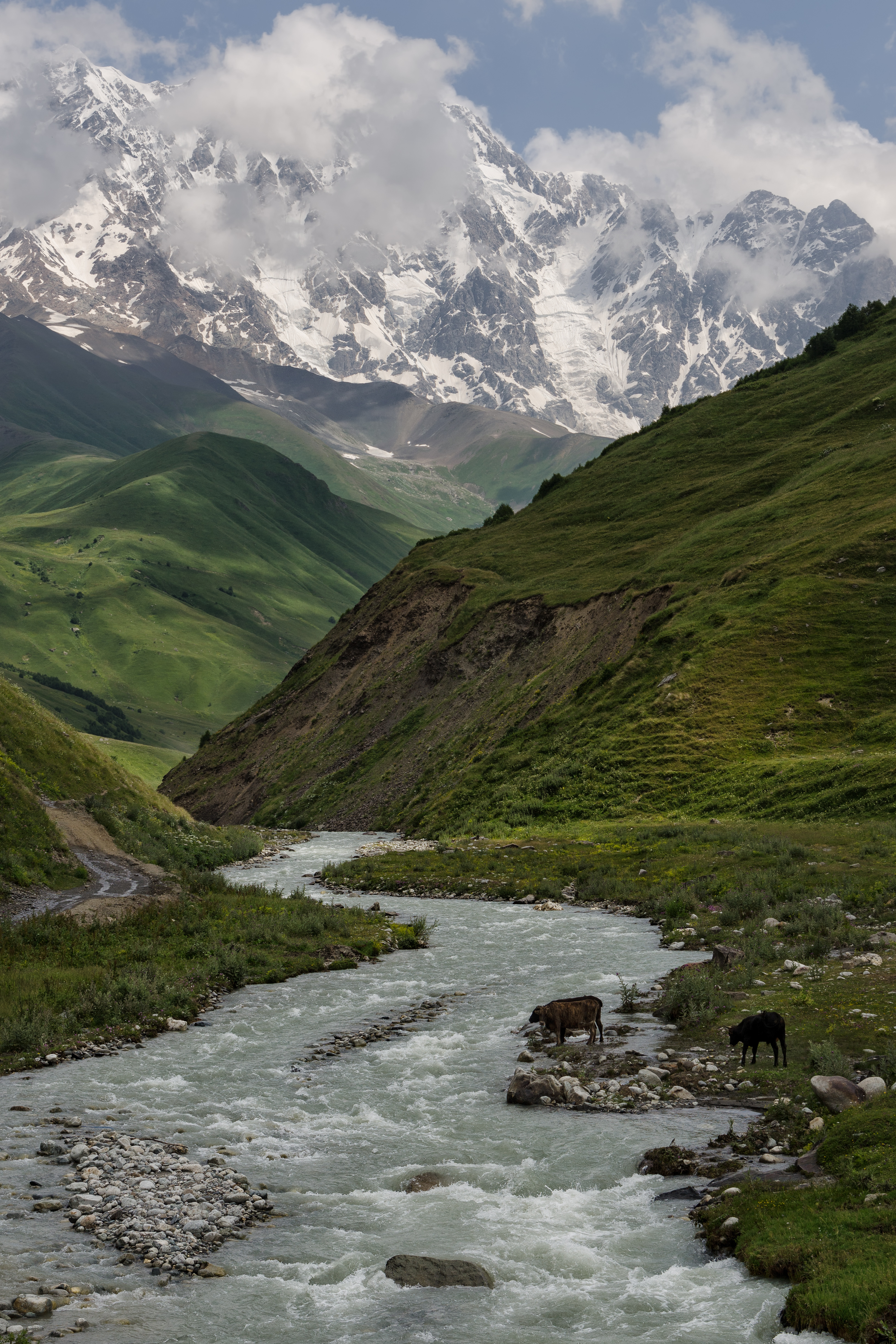 Грузия, дорога к леднику. Очень нравится этот кадр, тут и S линия в виде реки, переходящая в гору и далее к снежным шапкам. Коровы задают масштаб и передний план. И красиво ложится свет на холм и тени от облаков.
