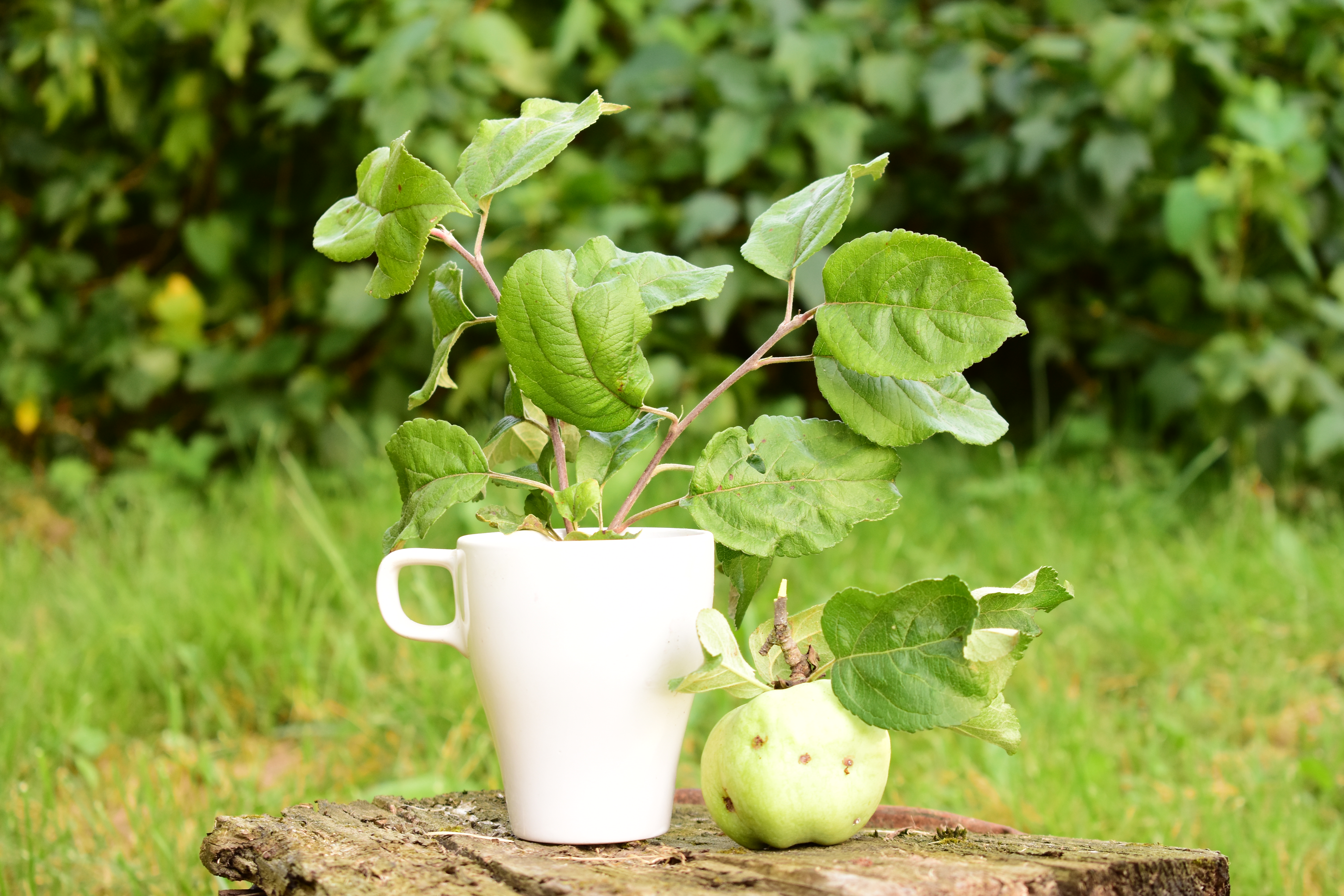 Композиция с кружкой и яблоком здорово выделяется в переднем плане.