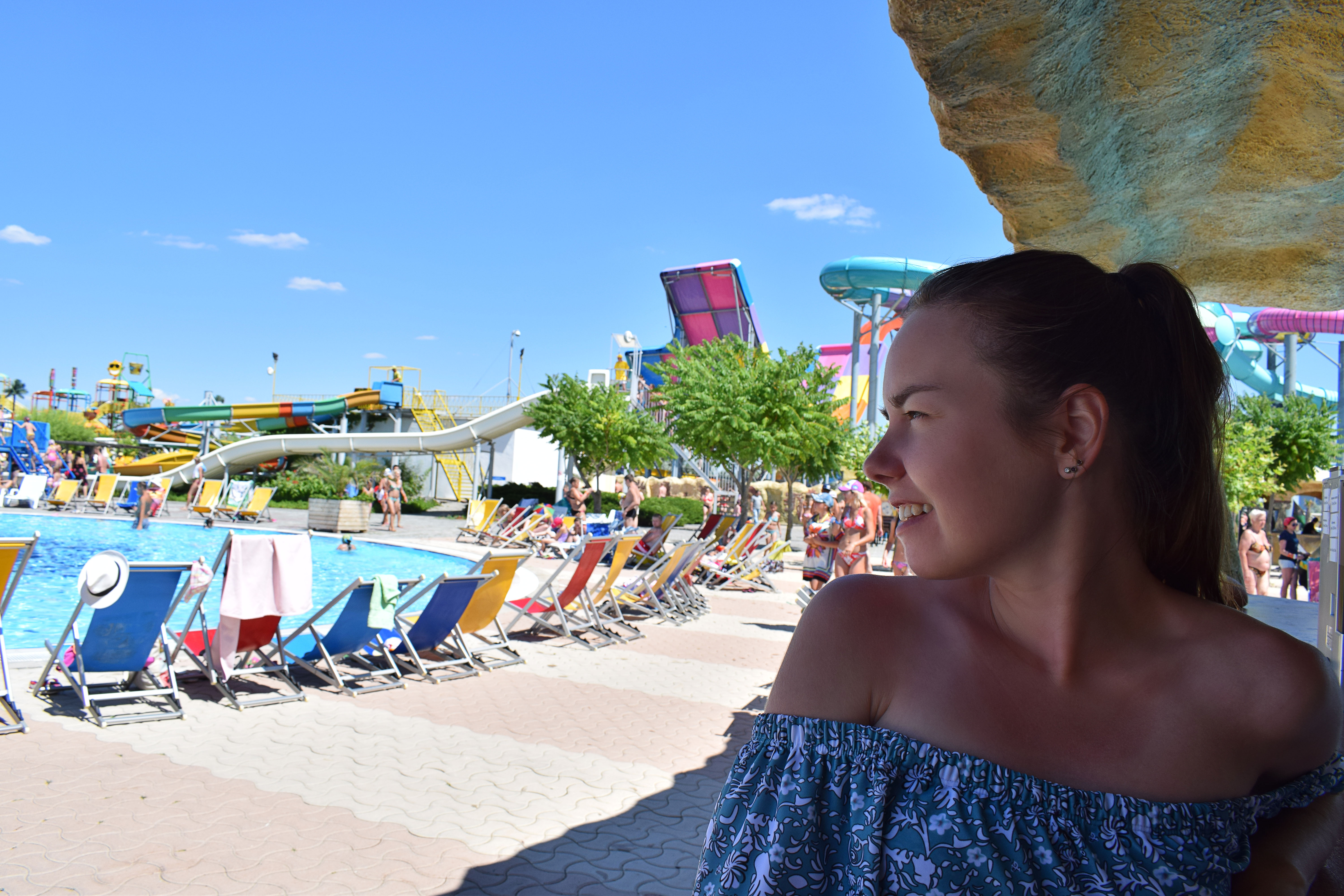 Модель в тени, а яркие детали аквапарка интенсивно освещены. Акцент больше на детали аквапарка, а модель вышла темновато. Стоило выбрать освещение модели более интенсивное или применит вспышку. А также хорошо бы выдержать горизонтально ровнее кадр, ведь наклон вправо ощутим и вносит дисбаланс.