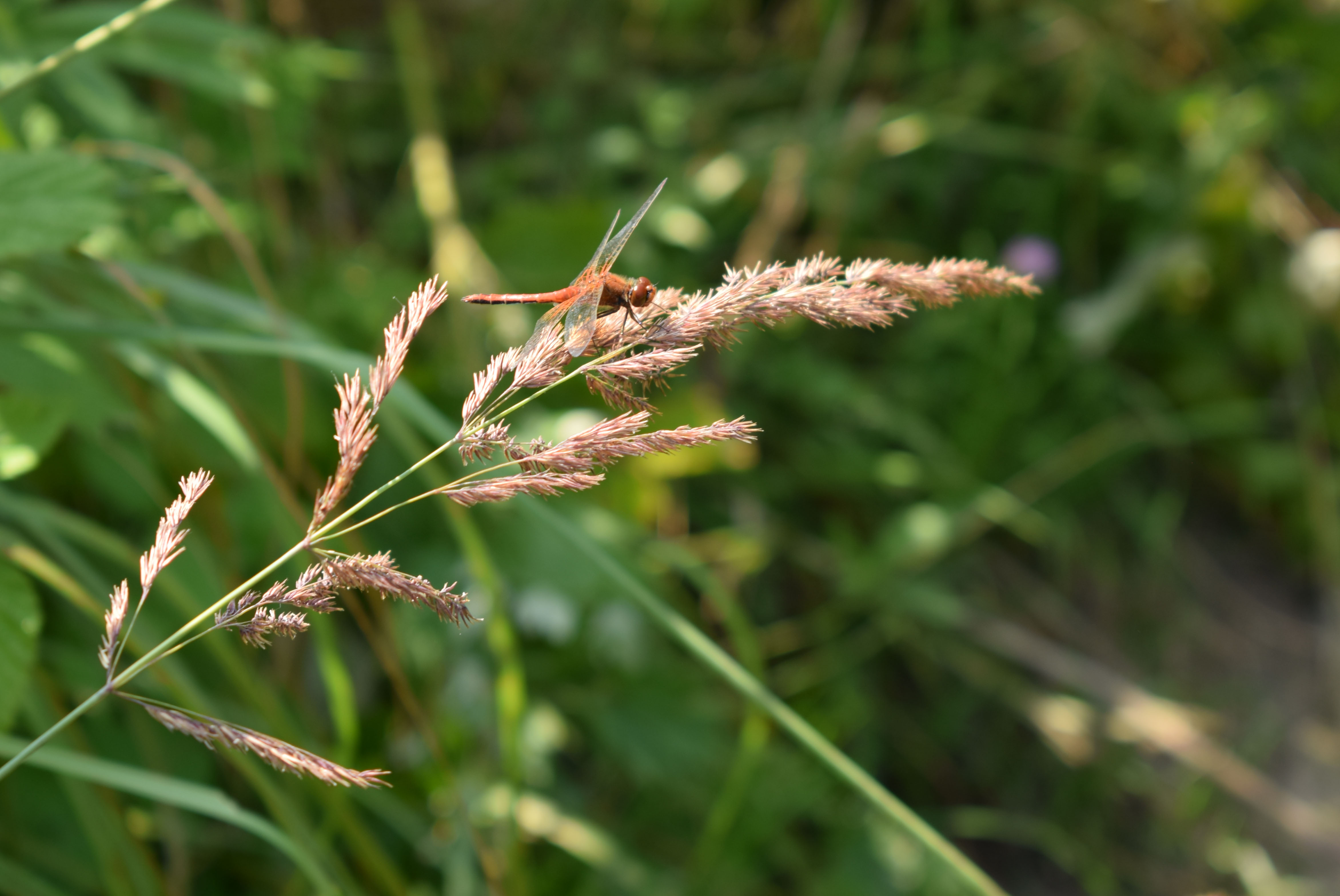 Диафрагма приоткрыта и использовано длинное фокусное расстояние объектива, поэтому глубина резкости получилась маленькая, размытый фон усиливает внимание на стрекозе.
