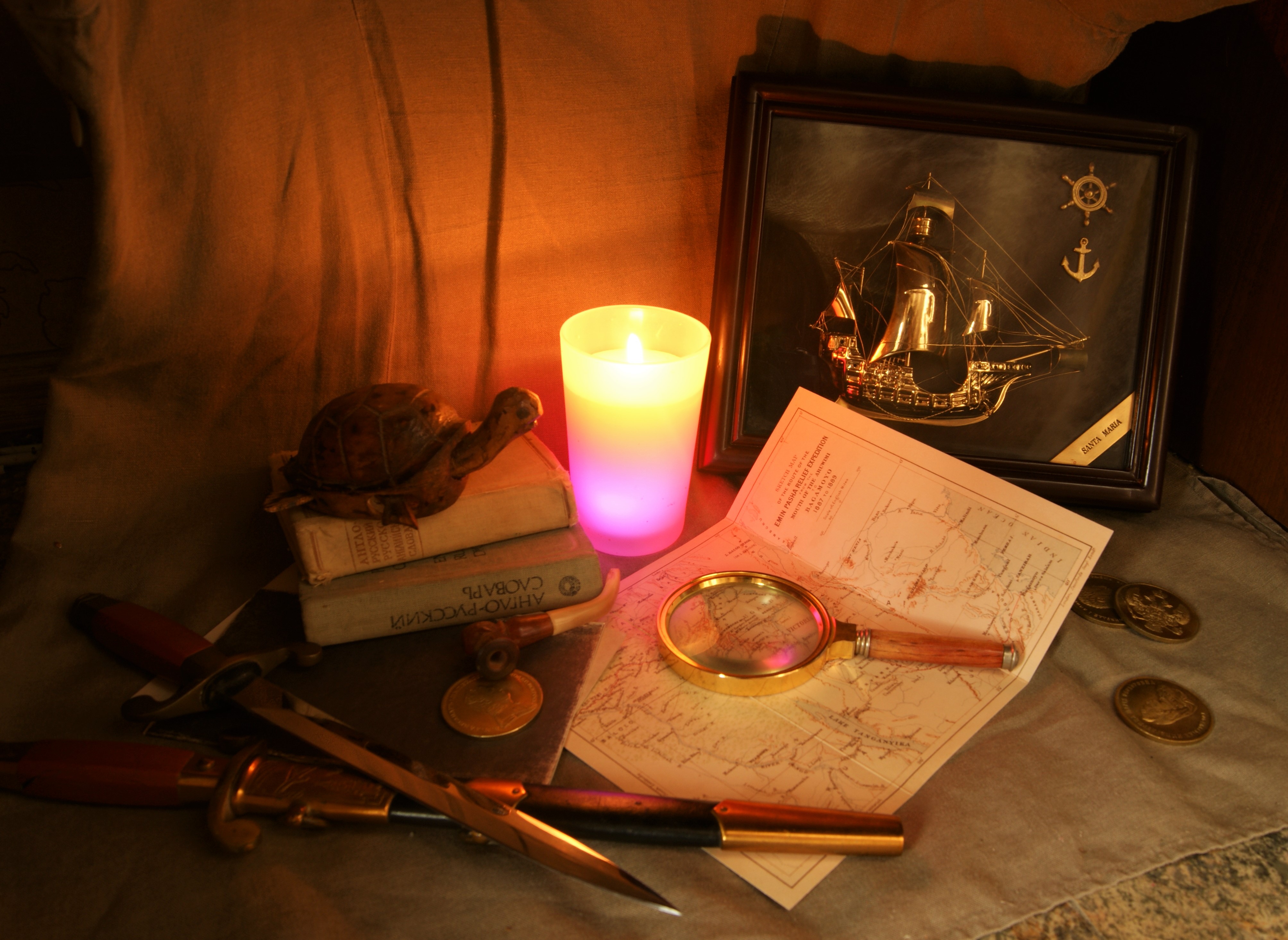 Вдохновившись просмотренным фильмом "Пираты Карибского моря" я решила создать натюрморт по тематики этого фильма. Мне очень нравится свет от свечи, а также цветовое сочетания дерева и золота. Я довольна результатом.