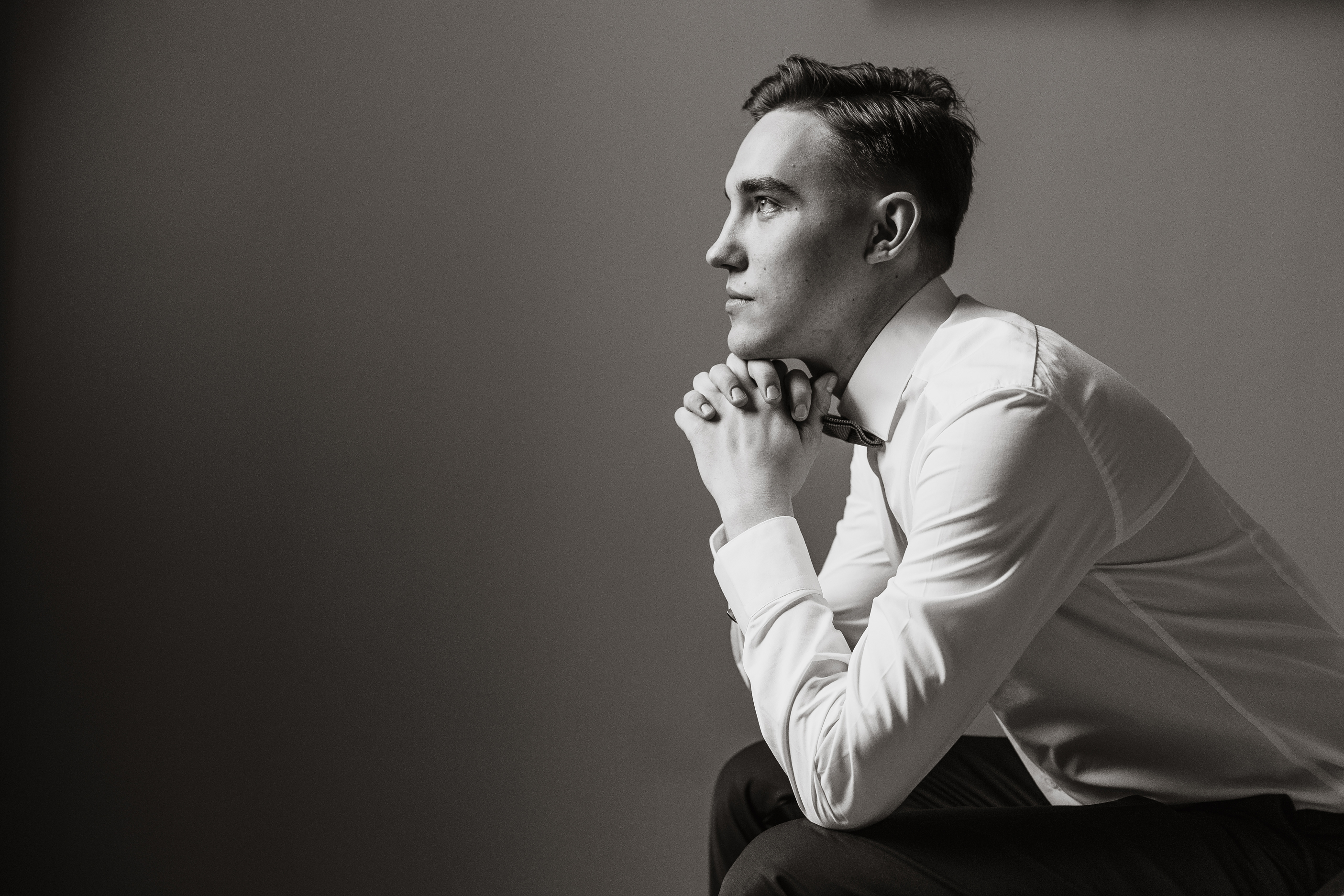 Портрет жениха напротив окна. В ЧБ понравилось больше, чем в цвете, отсекает все лишнее, как мне показалось. По настройкам у меня здесь завышенное ИСО, можно было уменьшить как минимум в 2 раза. Снимала утро жениха и невесты, постоянно менялась экспозиция и выбрала "рабочее" исо своей камеры, чтобы не получить короткую выдержку и смазы.