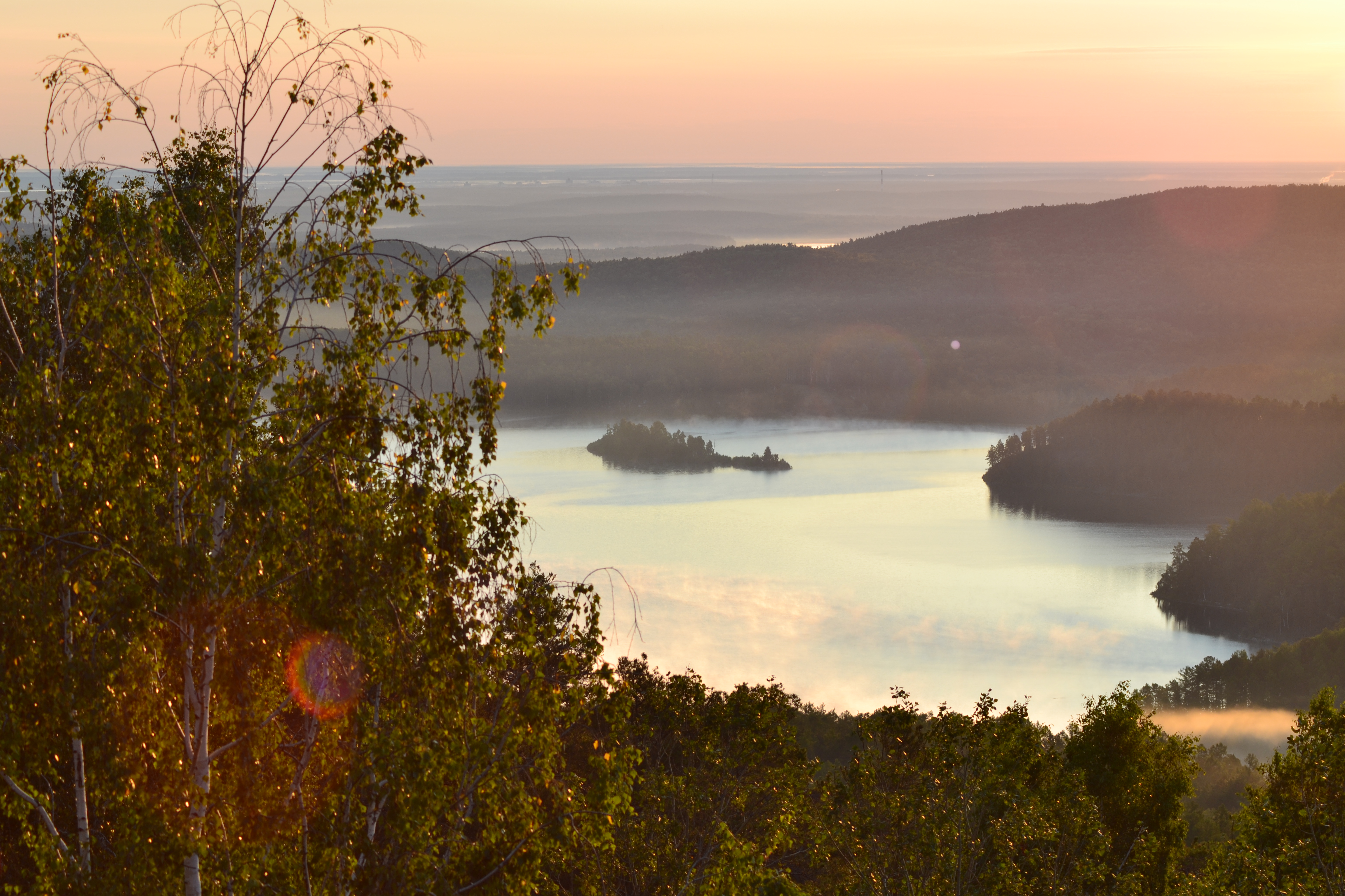 Прекрасный пейзажный образ! Высокая точка позволила развернуть планы наглядно. Высота. Масштаб. Расстояния. Всё это легко передано с помощью многоплановой компоновки, выразительного освещения, наполнившего сцену теплыми красками и переданными достоверно с помощью коррекции баланса белого. Отражение неба в водной поверхности просто гипнотизирует.