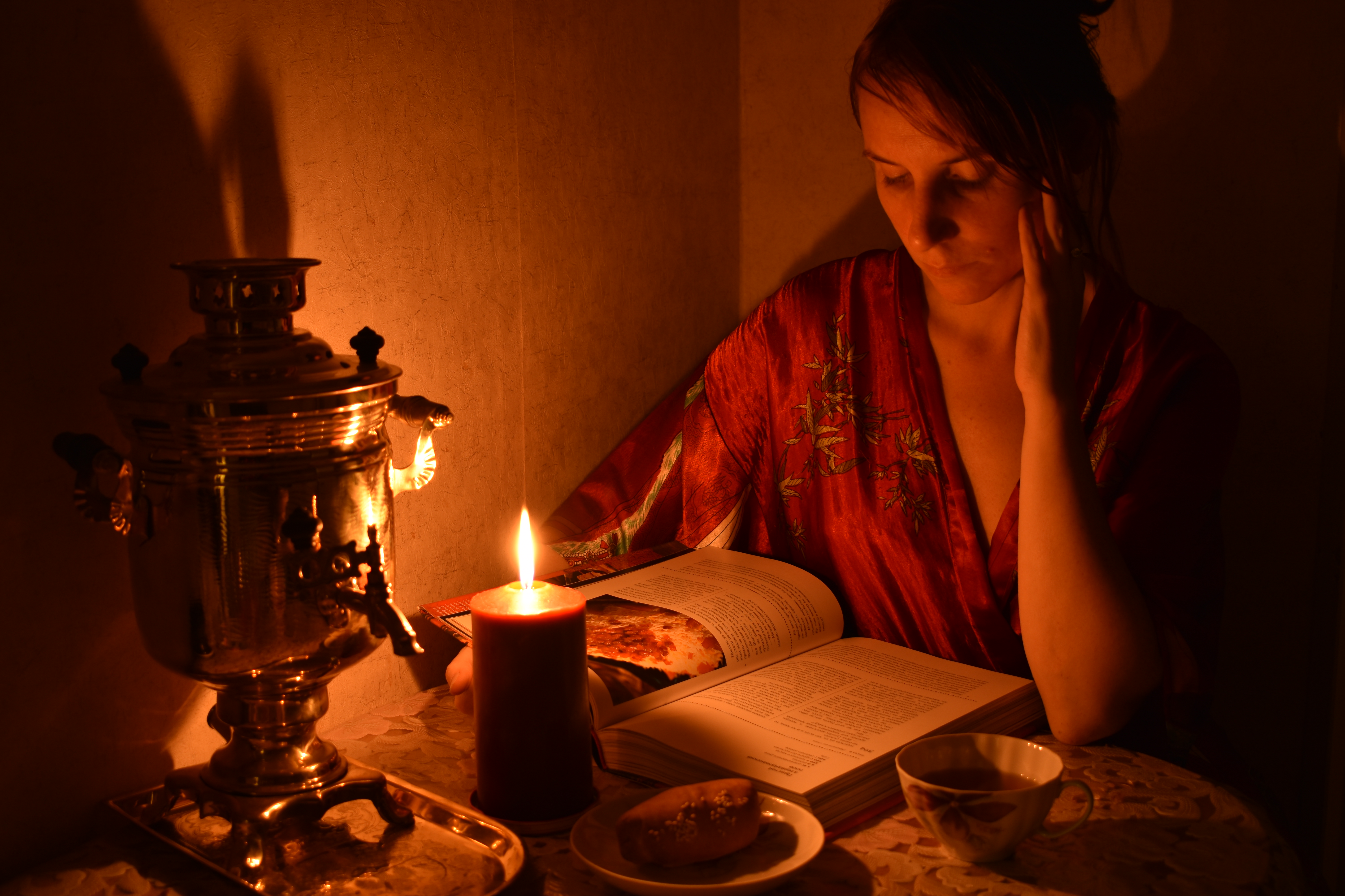 Освещение смешанное. Чуть-чуть рассеянного света из коридора (лампочка) - показать детали в тенях, остальное - свеча. Использован штатив
