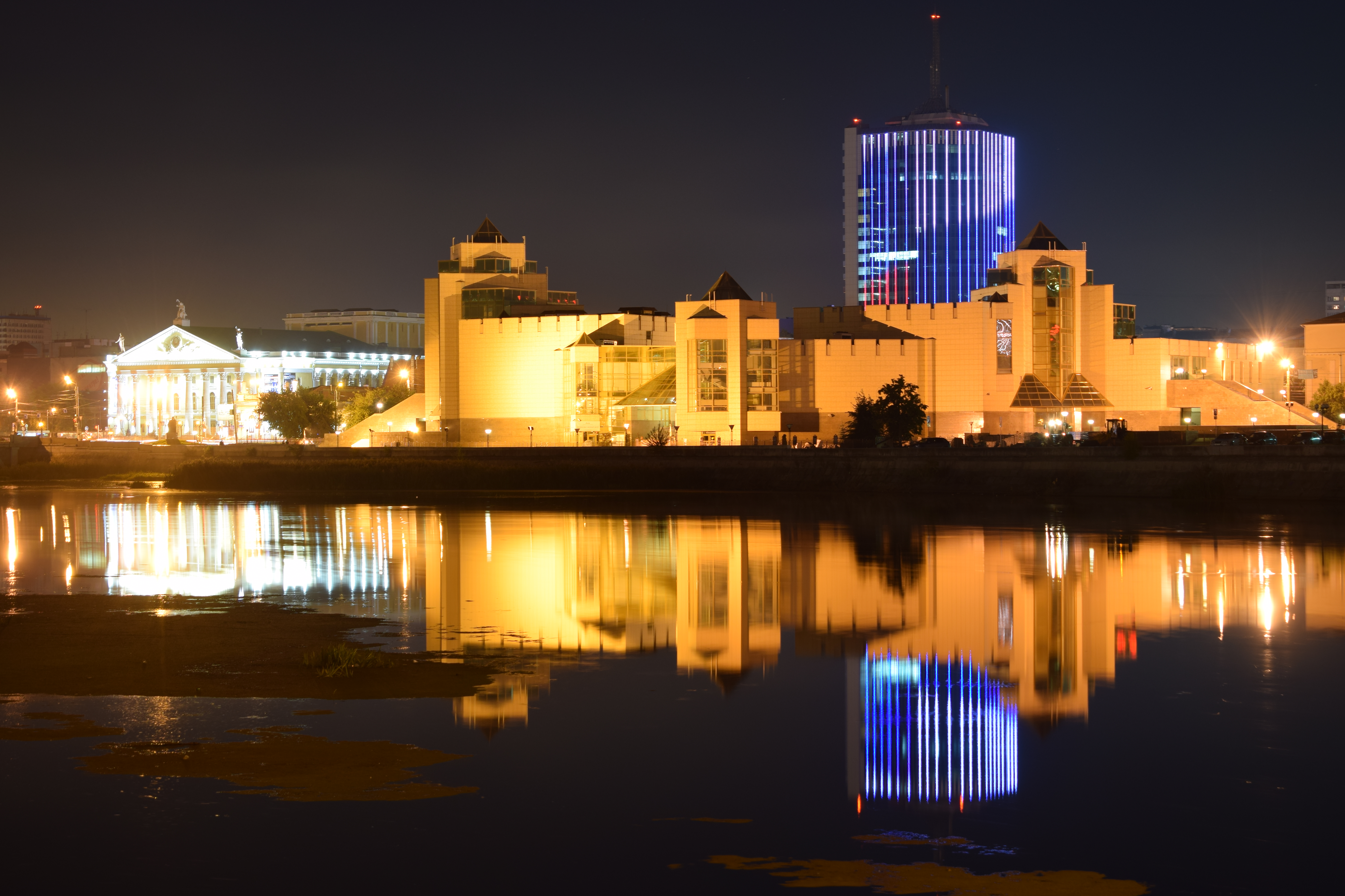Здания здорово подсвечены. Особенно ярко выделено здание с синими огоньками, линиями. Оно расположено в активной части кадра и выделено, как зрительный центр.