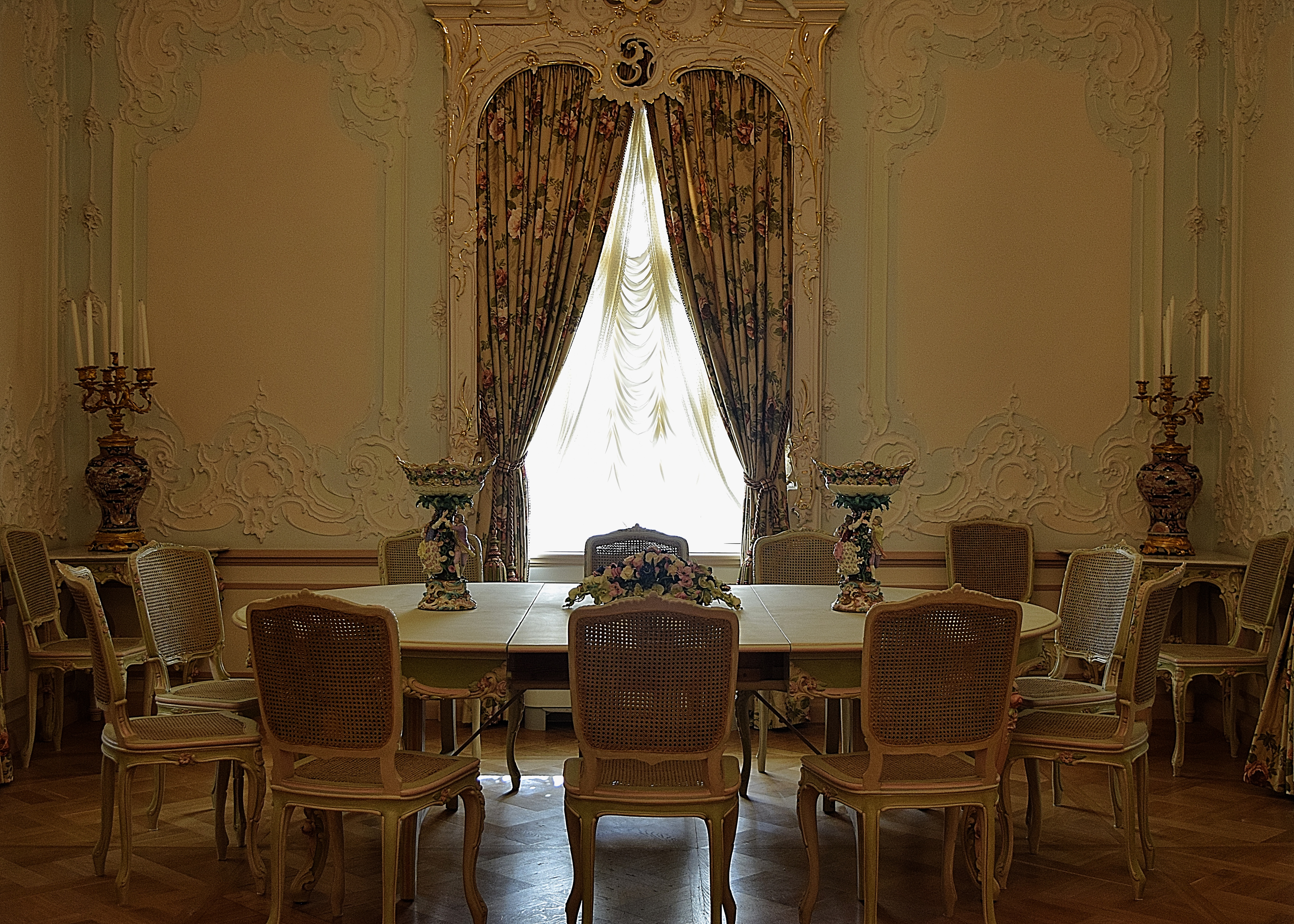 К сожалению, вспышкой пользоваться в зале Ораниенбаума было нельзя, поэтому снимок темноват, но зато передает камерную и винтажную атмосферу дворца - делового чаепития у окна