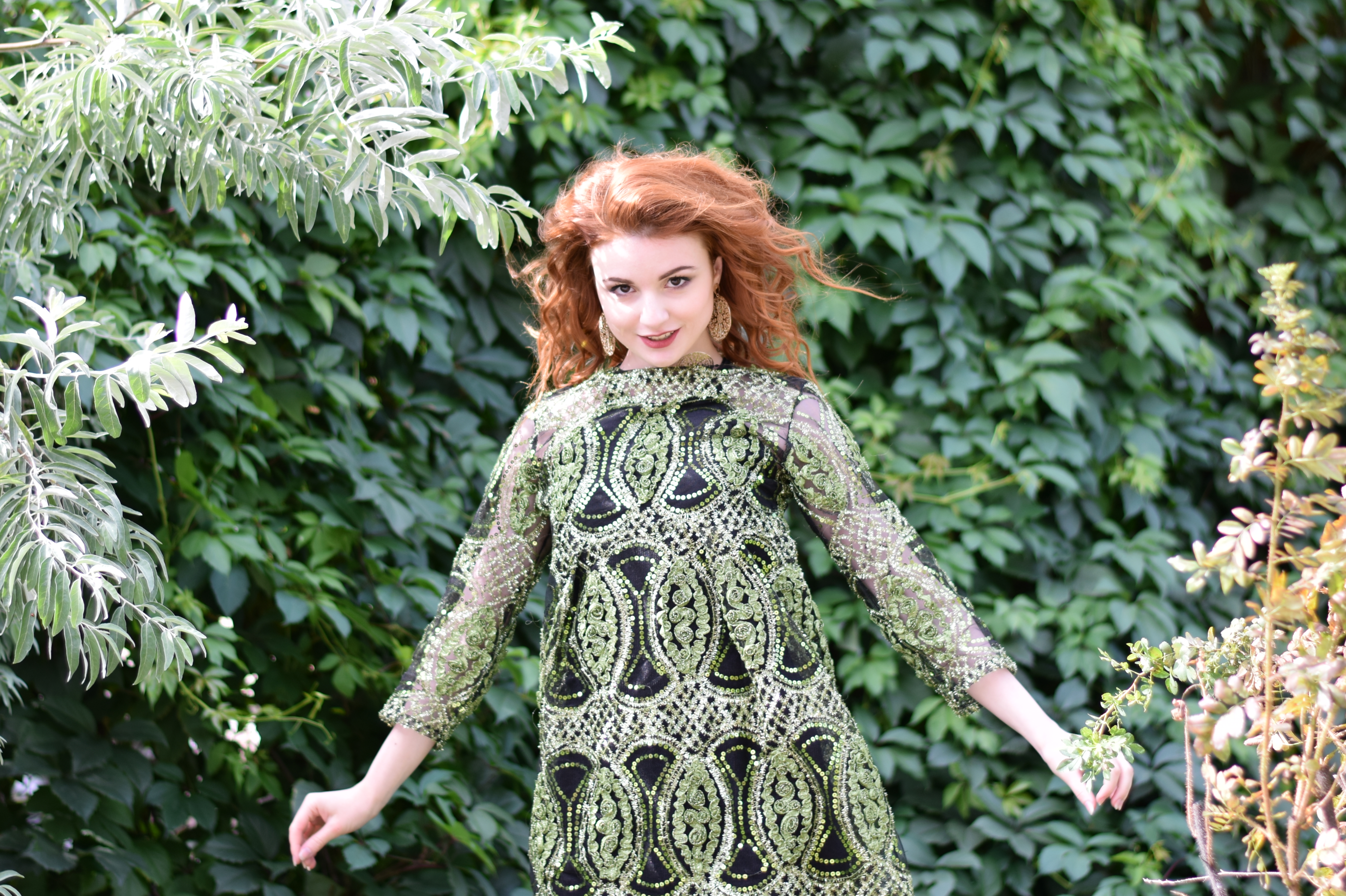 Платье здорово перекликается с фоном , сливается с ним. Таким образом усиливается внимание на лице модели.
