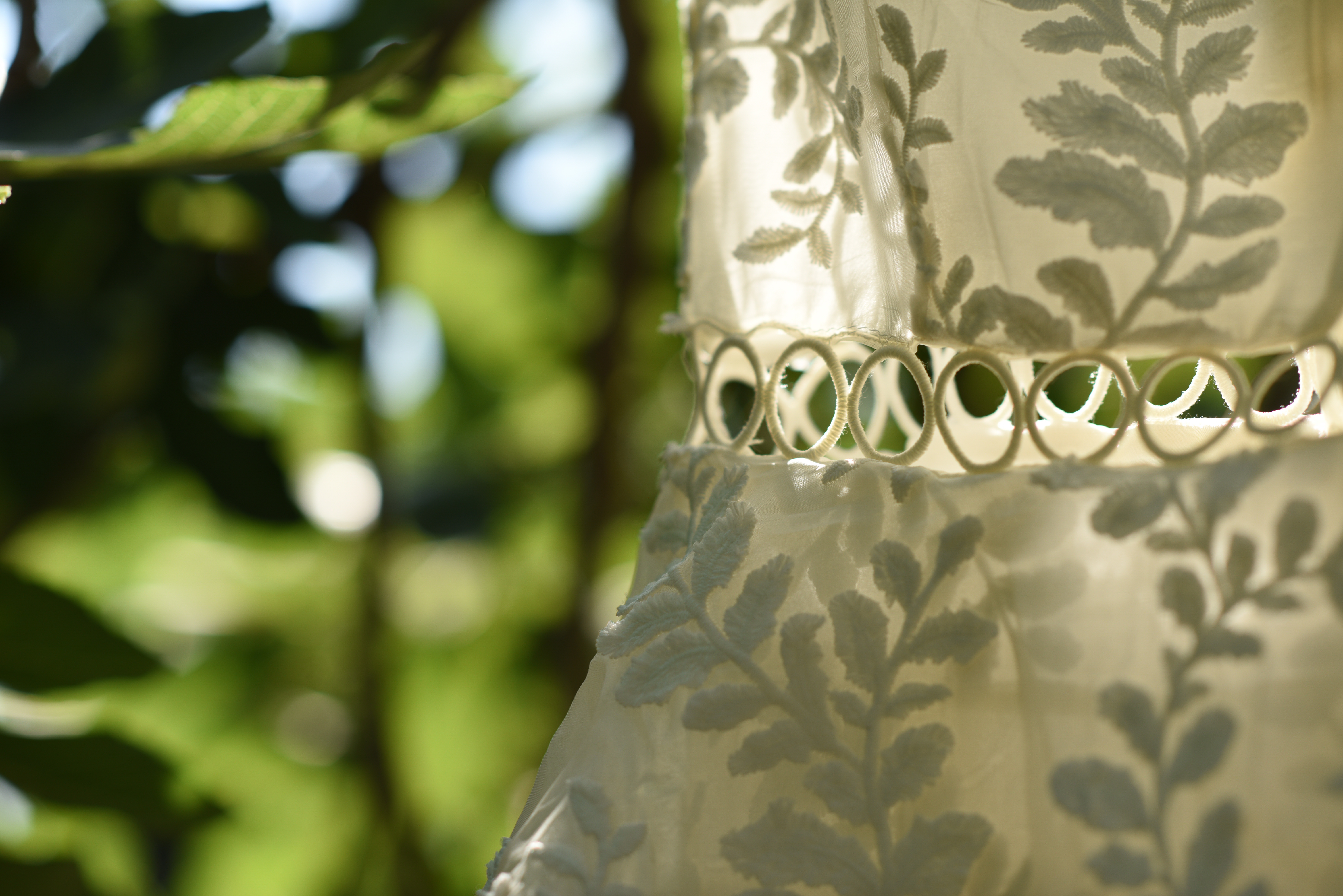 Хорошая работа. Получилось показать легкость ткани, так же контровой свет интересно подчеркивает ее фактуру и орнамент на просвет. Этот же растительный орнамент интересно перекликается с растениями на заднем плане. Открытая диафрагма обеспечила хорошее размытие фона, что позволило отделить его от основного объекта съемки. Параметры удачно подобраны при съемке.