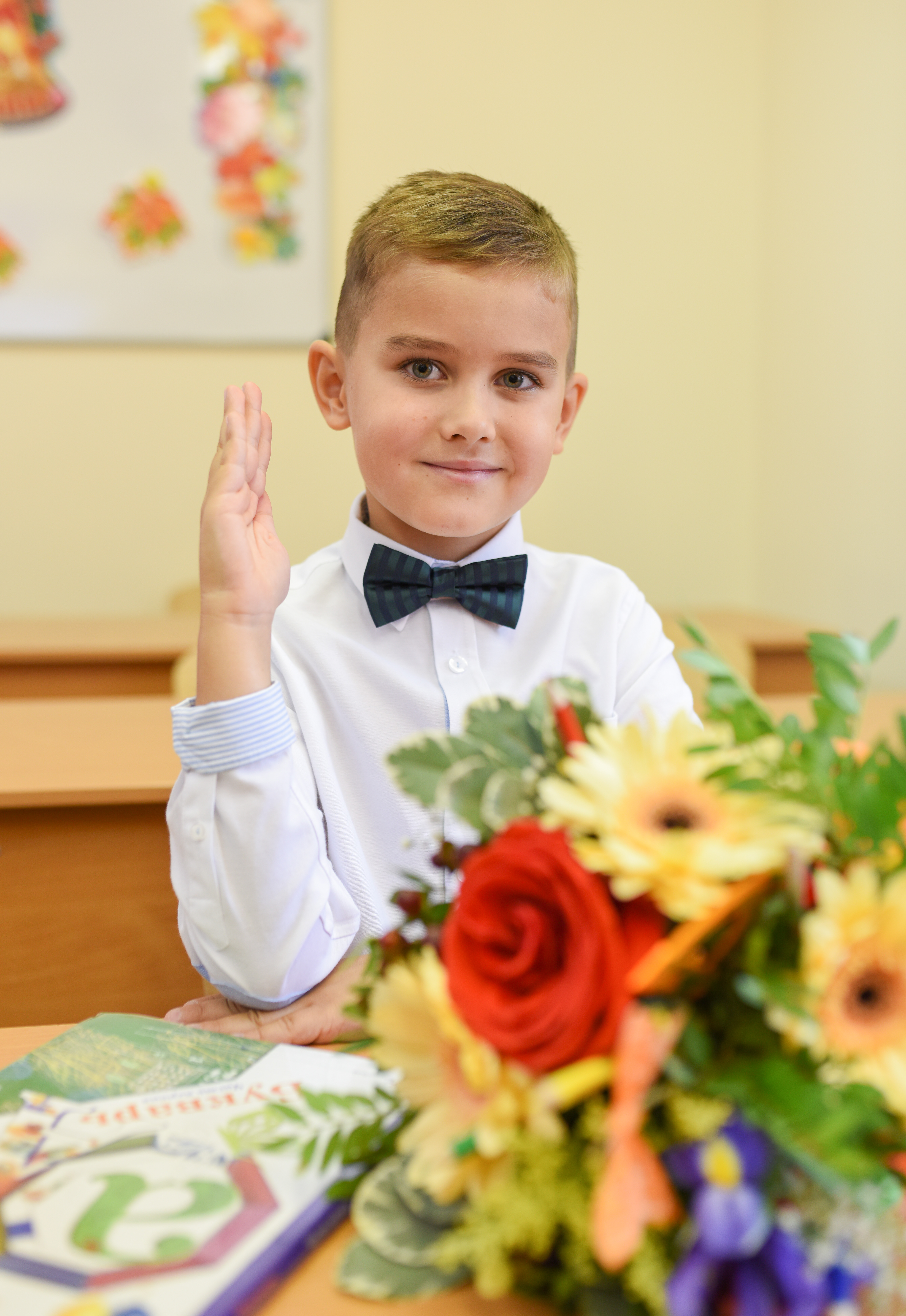 Хороший портрет в интерьере школьного кабинета. Цветы на переднем плане хорошо передают настроение праздника. Фокус попал точно по глазам модели. У снимка хорошая резкость.