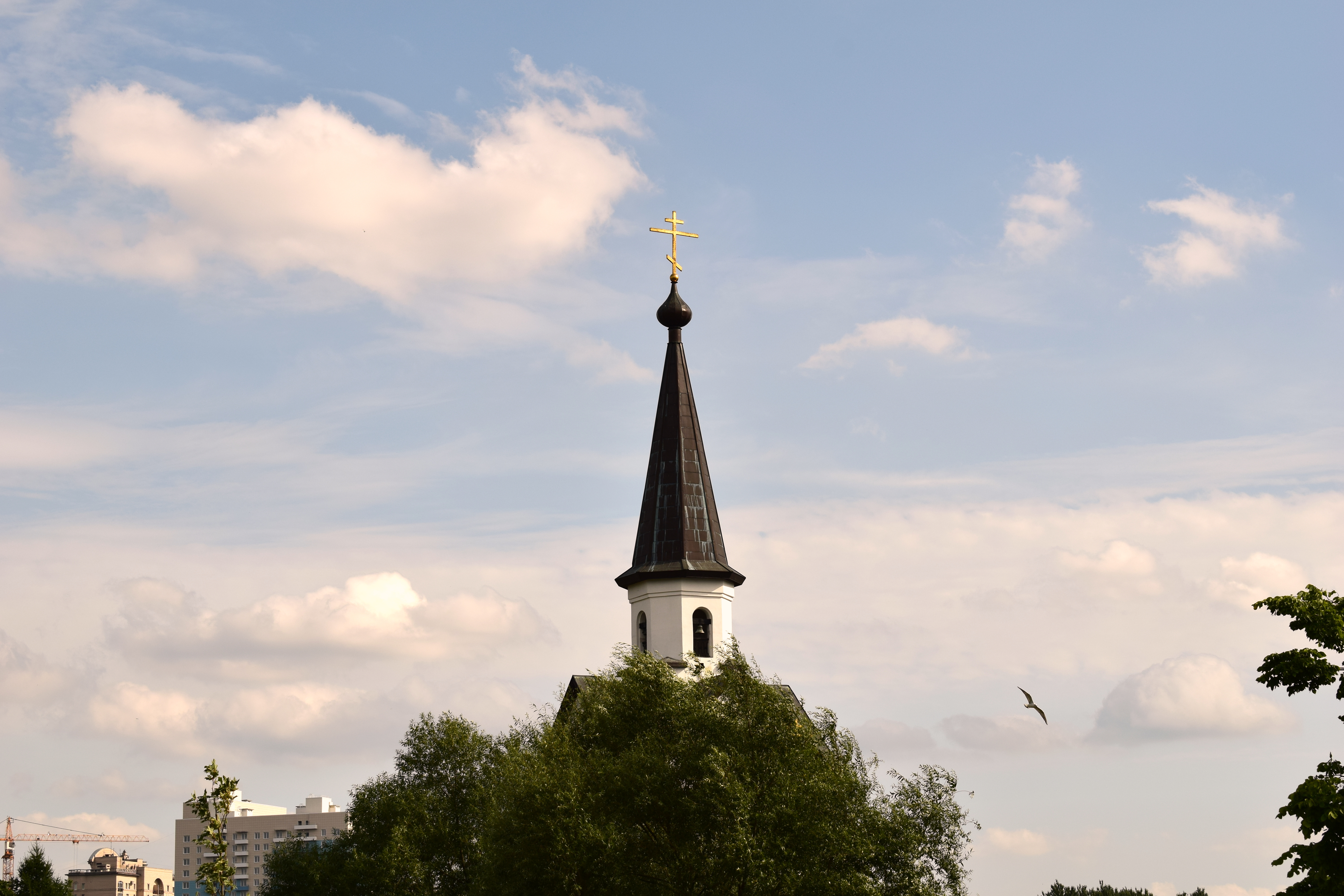У вас получился достаточно минималистичный кадр - очень много неба на снимке, и почти нет архитектуры. Облака придают небу фактурность. Деревья и птица оживляют кадр.