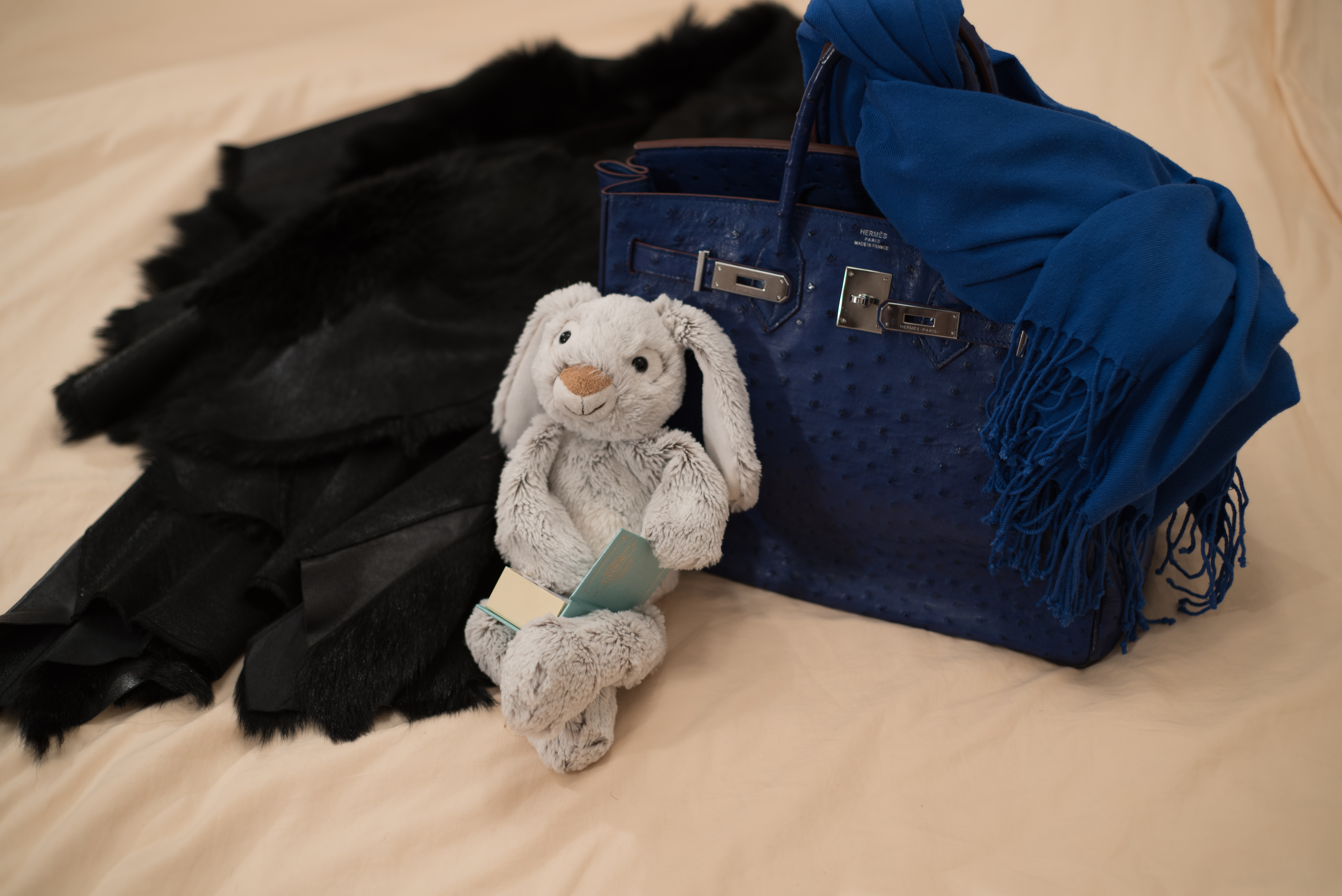 Кролик отлично выделяется на фоне синей сумки.